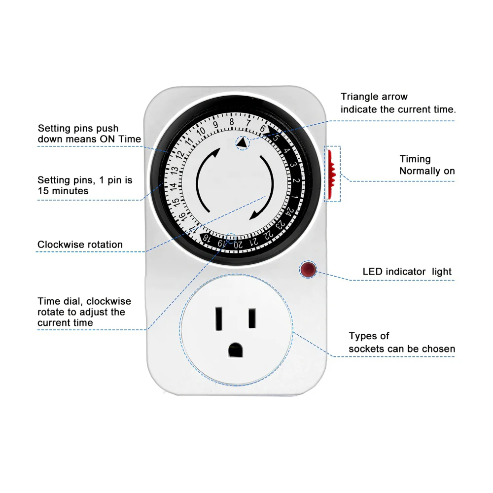 Переключатель таймера может уменьшить потребление энергии и помочь сэкономить энергию. Используйте удобный таймер для включения и выключения сковородок, телевизоров, вентиляторов, печей и других электронных устройств, чтобы уменьшить затраты энергии и сэкономить.