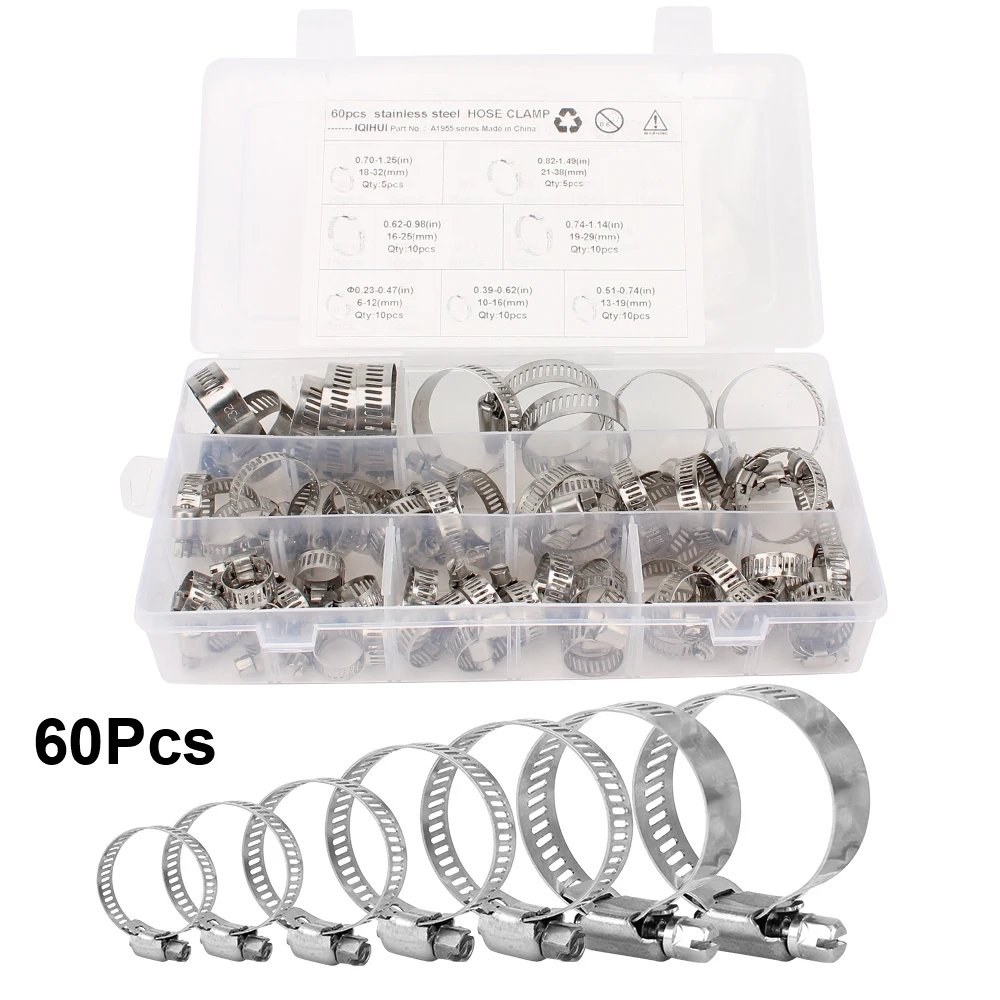 Характеристики:Материал: нержавеющая стальРазмер: как показаноШироко используется в: автомобилях, тракторах, кораблях, бензиновых двигателях, дизельных двигателяхПодходящий диаметр шланга:0,7-1,25 (in)/18-32(mm), 0,82-1,49 (in)/21-38(mm), 0,62-0,98 (in)/16-25 (мм), 0,74-1,14 (дюйм)/19-29 (мм), 0,23-0,47 (дюйм)/6-12 (мм), 0,39-0,62 (В)/10-16 (мм), 0,51-0,74 (В)/13-19 (мм).В комплект входит:0,7-1,25 (В)/18-32 (мм) Кол-во: 5 шт.0,82-1,49 (В)/21-38 (мм) Кол-во: 5 шт.0,62-0,98 (дюйм)/16-25 (мм) Кол-во: 10 шт0,74-1,14 (В)/19-29 (мм) Кол-во: 10 шт.0,23-0,47 (дюйм)/6-12 (мм) Кол-во: 10 шт0,39-0,62 (В)/10-16 (мм) Кол-во: 10 шт.0,51-0,74 (В)/13-19 (мм) Кол-во: 10 шт.