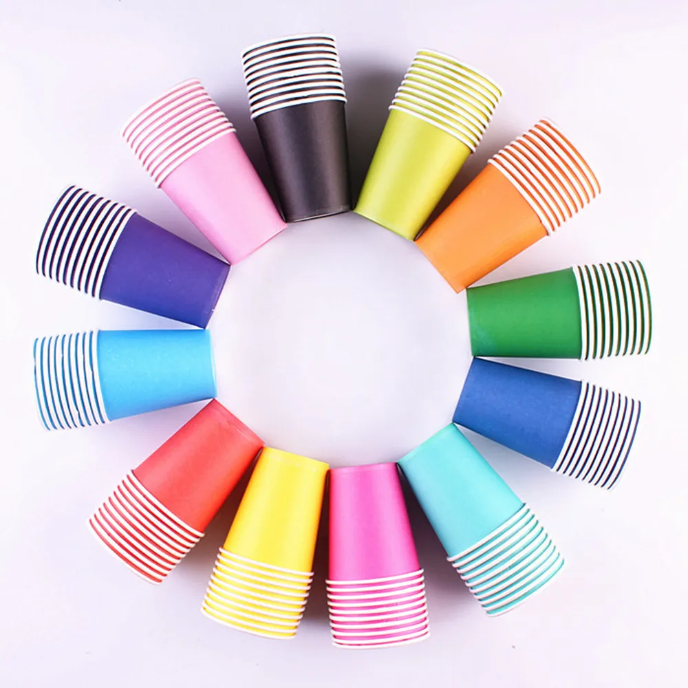 10 шт./лот одноразовые стаканчики с 250 мл из бумаги красные, синие, зеленые, розовые, желтые, фиолетовые, оранжевые вечерние принадлежности для украшения дня рождения