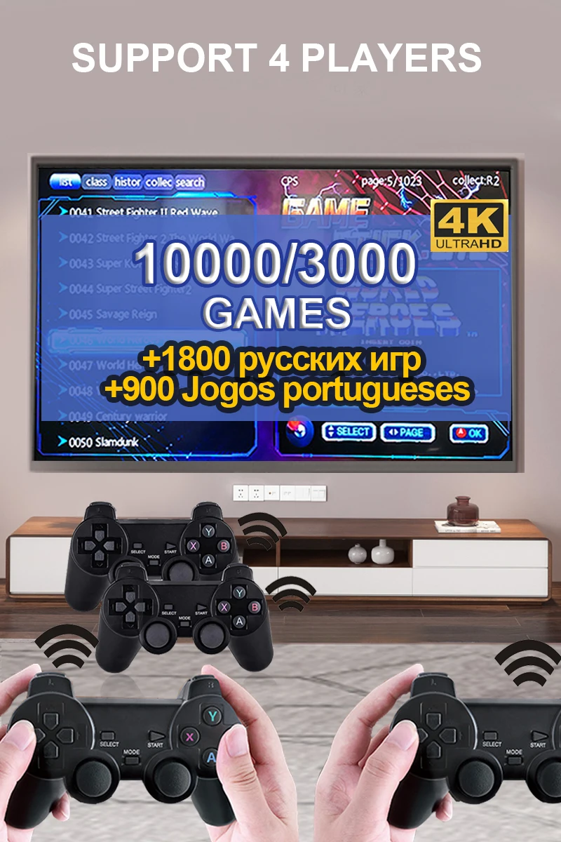 Оснащен двумя 2,4 ГГц беспроводной игровой контроллер. Поддержка до 4 игроков одновременно, вы можете дистанционно управлять и наслаждаться игрой на диване с семьей или друзьями. Новейшая беспроводная ТВ-игровая консоль с картой памяти 64G, встроенная более чем 10000 игр, возможность поиска, коллекционирования, хранения и поддержка загрузки ваших любимых игр;