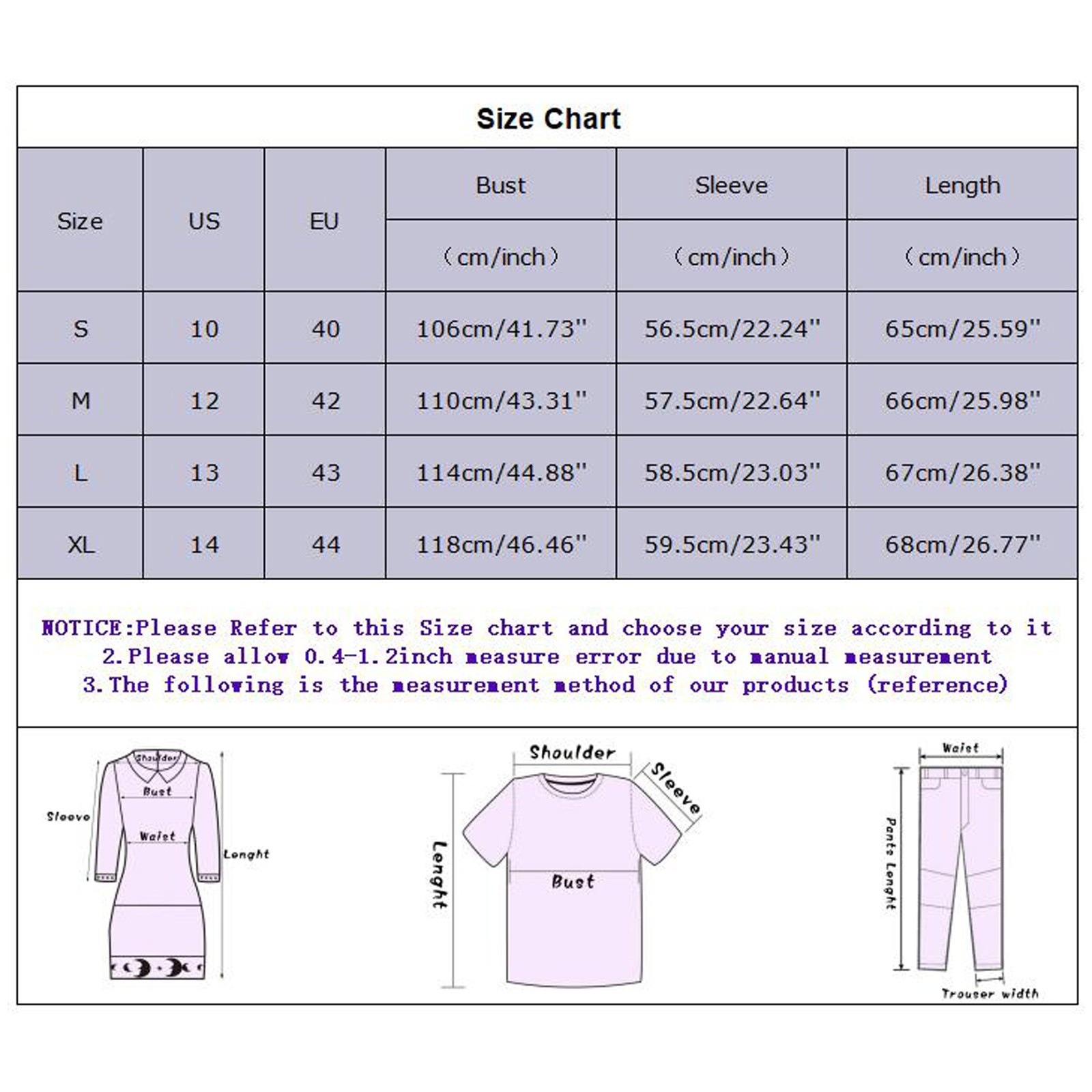 Size US EU Bust Sleeve Length S 10 40 106cm/41.73'' 56.5cm/22.24'' 65cm/25.59'' M 12 42 110cm/43.31'' 57.5cm/22.64'' 66cm/25.98'' L 13 43 114cm/44.88'' 58.5cm/23.03'' 67cm/26.38'' XL 14 44 118cm/46.46'' 59.5cm/23.43'' 68cm/26.77''