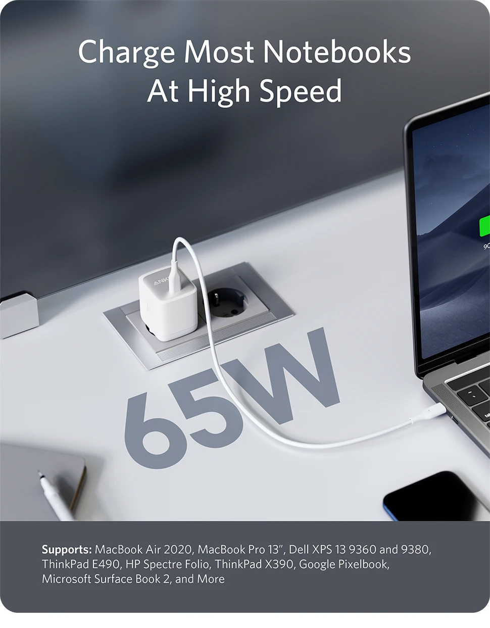 Выход 65W USB-C обеспечивает достаточную мощность для зарядки флагманских ноутбуков, включая MacBook Air 2020, MacBook Pro 13 '', Dell XPS 13 9380, ThinkPad X390 и многое другое на высокой скорости.