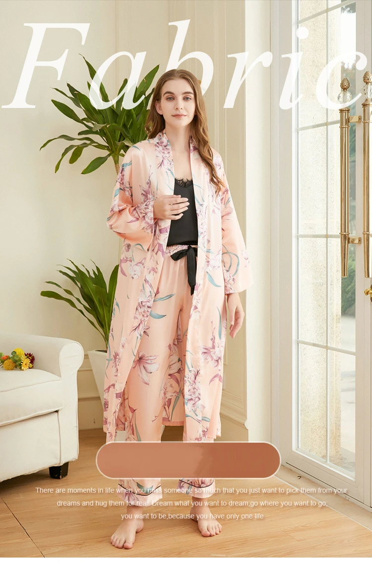 Посылка:1 * женские пижамы топ на бретельках + 1 * женские пижамы брюки + 1 * женские пижамы халат