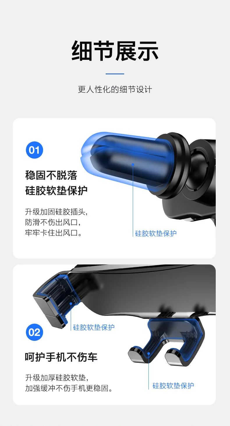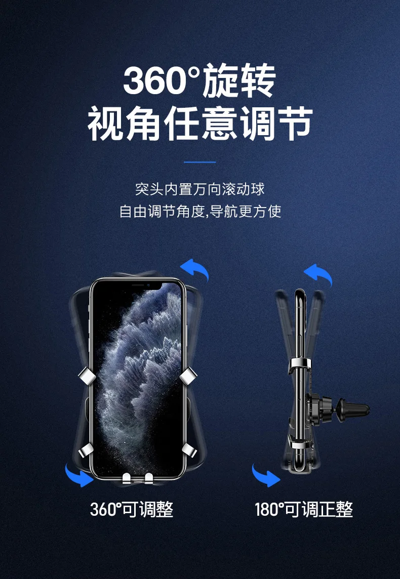 Дизайн: инновационный дизайн, гравитационная связь и треугольная поддержка, автоматически зажимается, когда телефон надевается на держатель, устойчивый и стабильный, отпустите автоматически, когда снимите телефон с держателя, легко и удобно. Прочная и хорошо Защитная: Высококачественная резка из алюминиевого сплава, поверхностное окисление, Для крепления на автомобиле используется эластичный и противоскользящий зажим, плотно удерживающий вентиляционное отверстие, мягкие резинки на вентиляционном отверстии, чтобы не царапать устройства.