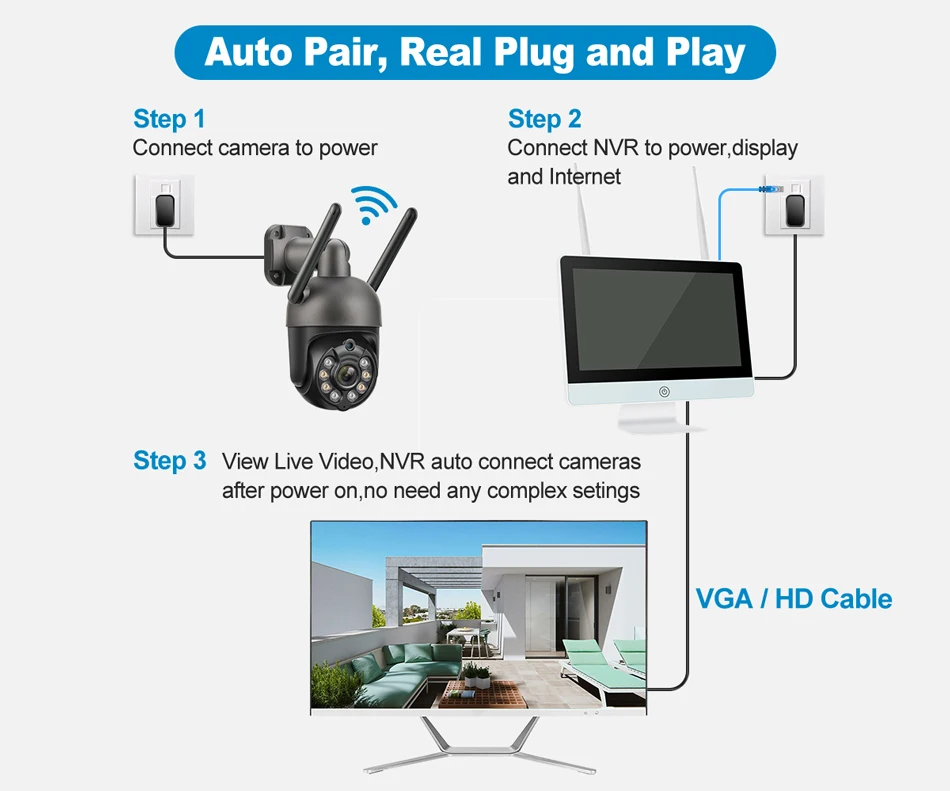 Обратите внимание: Беспроводная система не означает, что вы можете использовать систему без каких-либо кабелей. Источник питания по-прежнему необходим для питания камер и Nvr. (Вам нужно установить самостоятельно.)