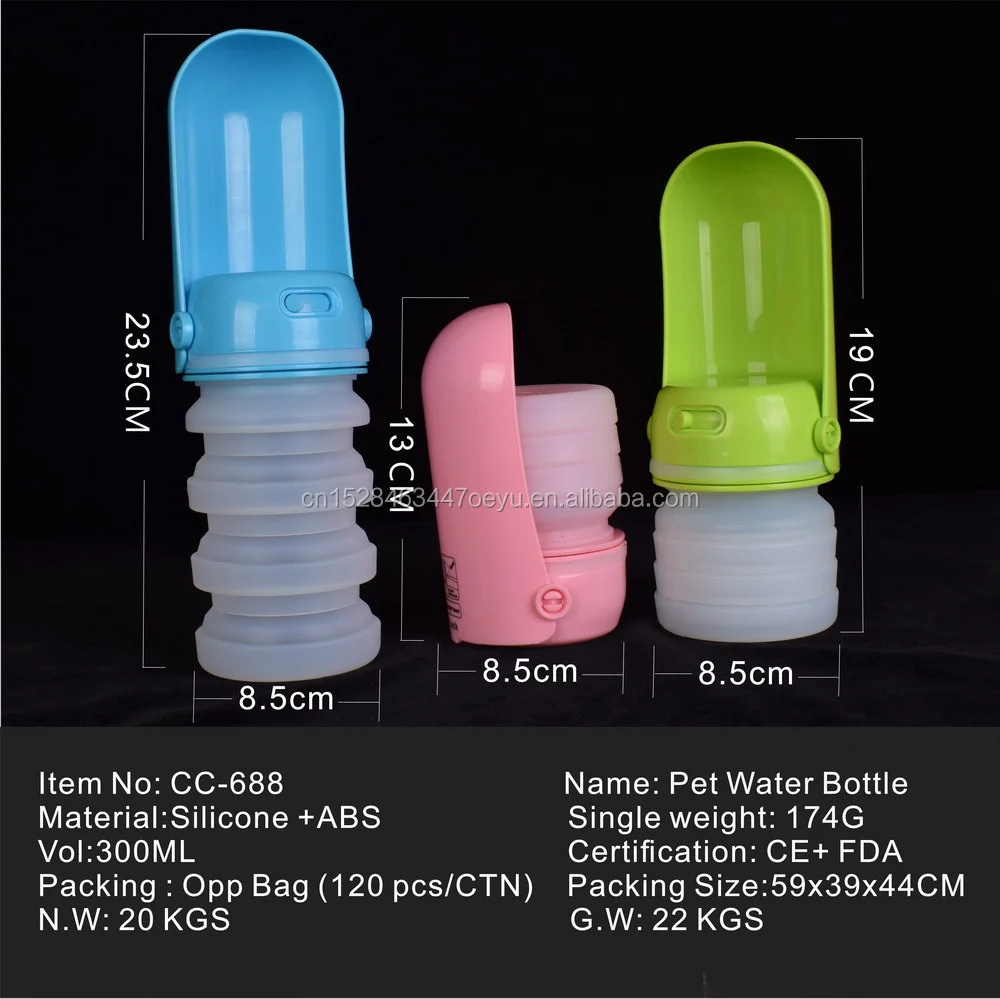 Packing : Pet Box Color: Pink,Blue,Green This water bottle is foldable, and can fit in your pocket, bag, or on your waist. The bottle can hold about 10 oz of water at its lowest capacity, and about 12 oz of water when fully stretched out. Unlike other bottles, this one is small, compact, and foldable and can fit in your bag, pocket, or in virtually any cup holder. Operation: This water bottle is very easy to fill up and operate, just make sure that when you are using it to tilt it slightly towards the ground, and make sure that the foldable part is clamped back and fully locked on. To fill this up with water, all you need to do is unscrew the top from the silicon bottom. It is very easy, and you will be pleased with it. Donation: We donate part of the profit on every sale to dogs charities throughout the USA and Canada, which means you will not only be receiving the latest and greatest dog water bottle on the market, but also be helping dogs in need.
