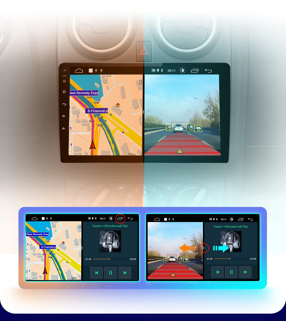 Когда автомобильное радио подключено к ADAS video recorder, это сделает передовую систему помощи при вождении, И предупредит вас, если ваш автомобиль слишком близко к переднему автомобилю или если ваш автомобиль отклоняется от полосы движения, чтобы помочь вашему вождению безопаснее и проще.