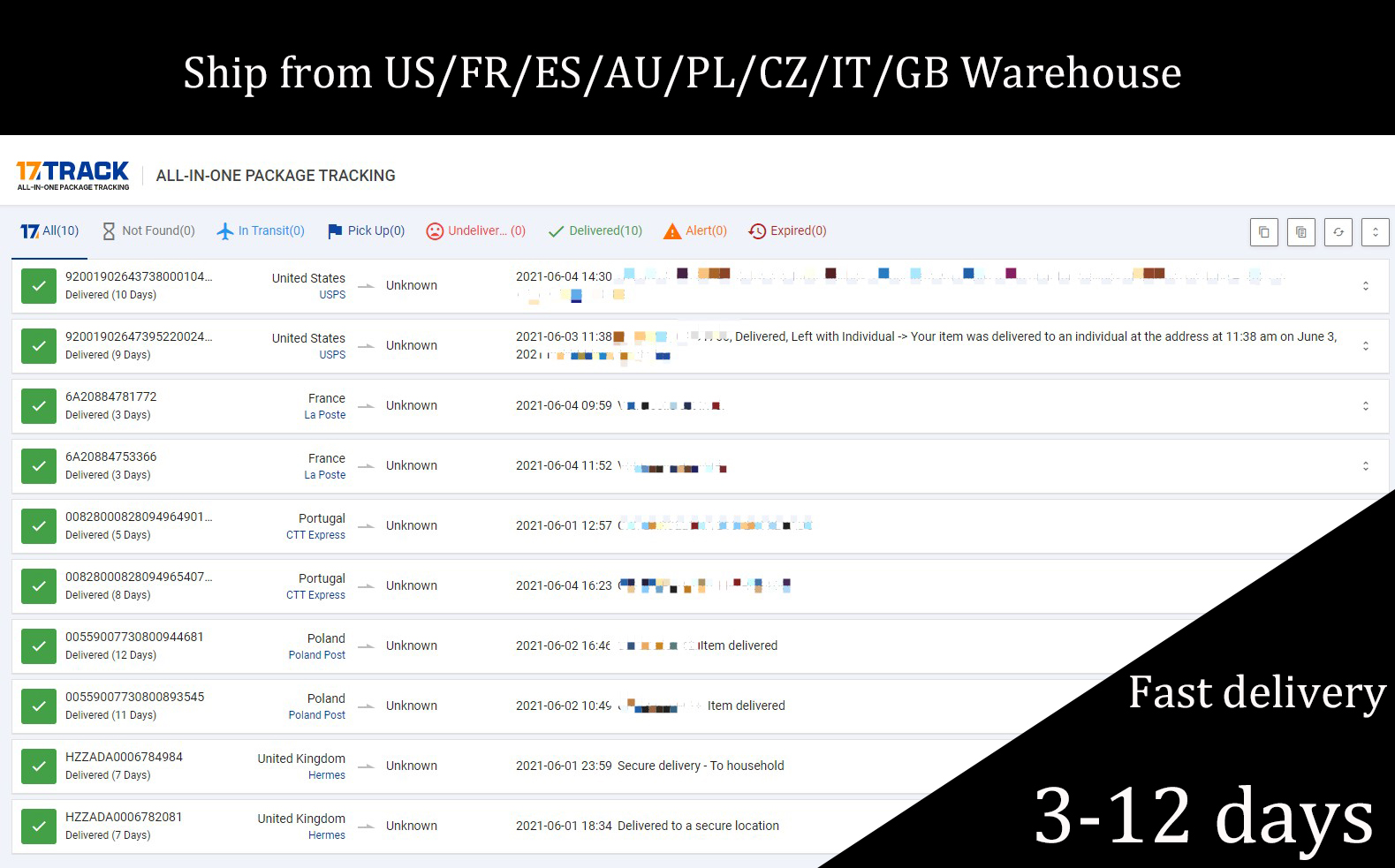 3. Доставка от нас/FR/ES/AU/PL/CZ/IT/UK/DE warehouse, срок доставки составляет около 5-18 дней после того, как мы отправим.
