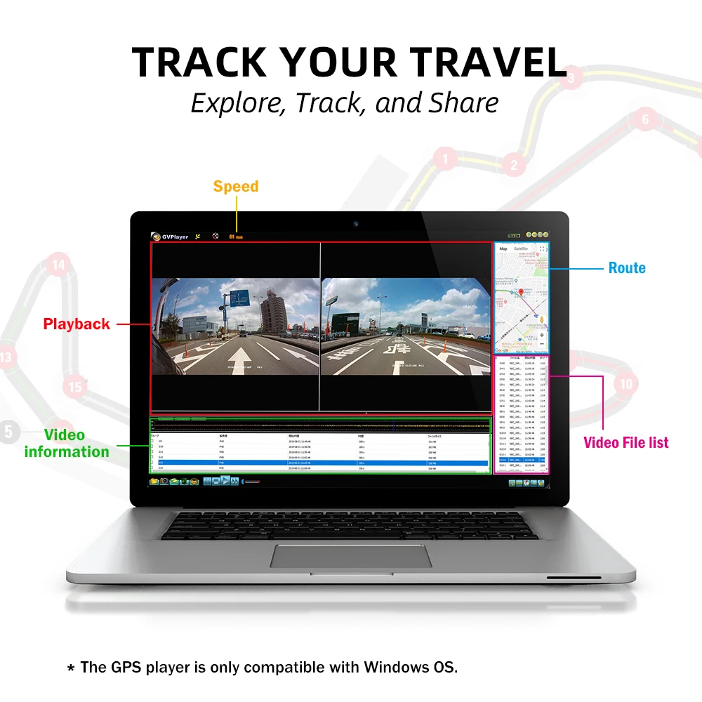 Подключенный gps-трекер автоматически отслеживает и индексирует каждое путешествие с скоростью, координатой и маршрутом, вы можете легко просмотреть отснятый материал через наш gps-плеер.