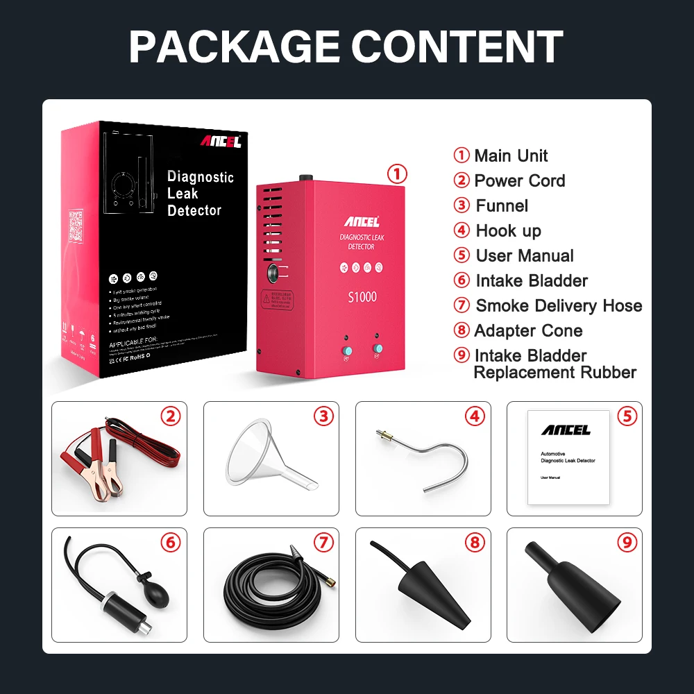 ANCEL S1000 детектор утечки дыма-универсальный и профессиональный тестер утечки дыма для автомобильной трубы. Это поможет нам быстро и точно установить утечку автомобилей мотоциклов на трубную систему, например: тест на впускную систему; Тест на выхлопную систему; Тест на герметизацию автомобилей; Испытание различных фитингов труб; Испытание системы топливного бака.