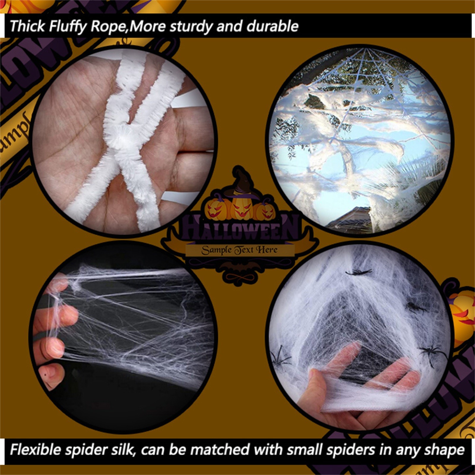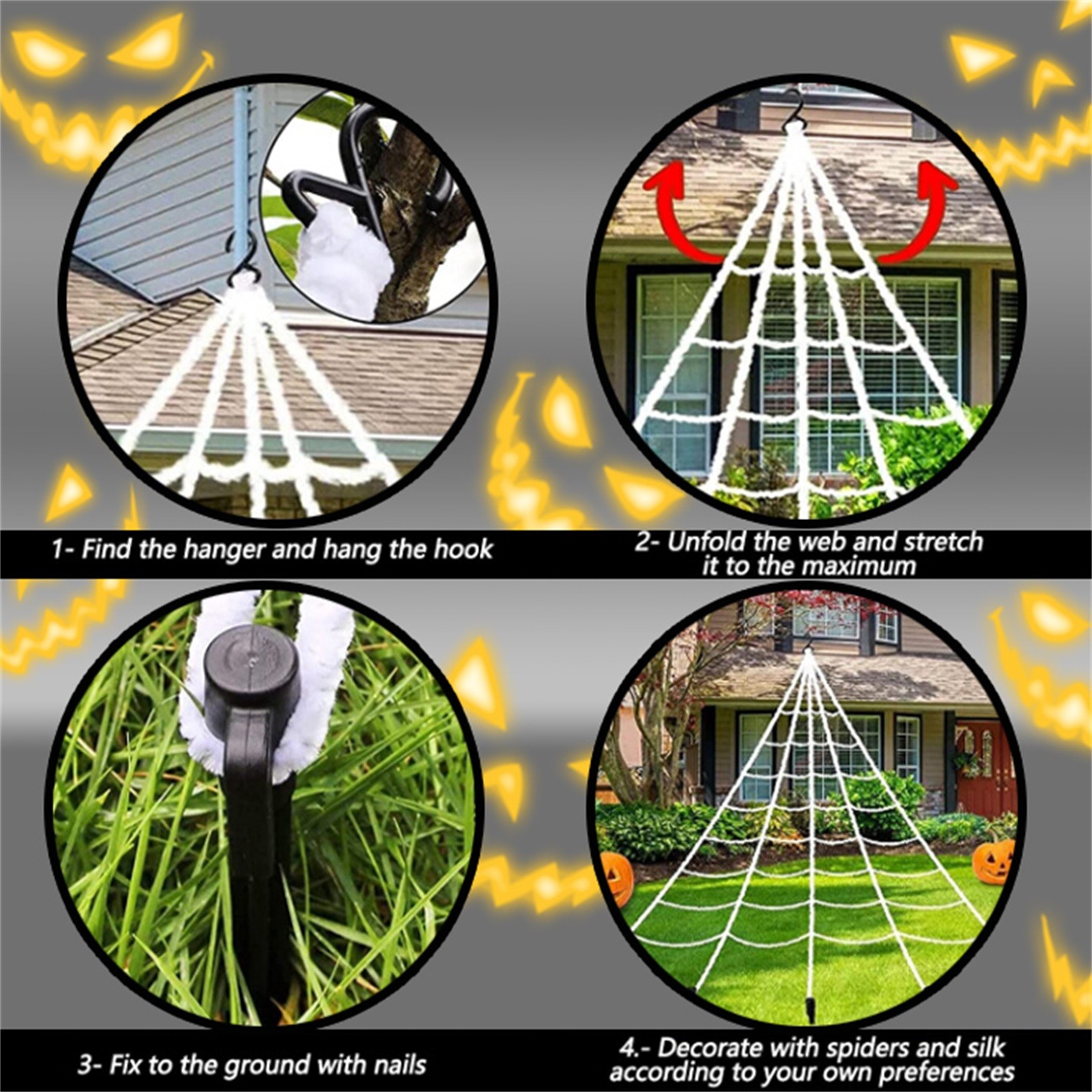 Giant Spider Webs Halloween Decoration : Triangular Spider Web made of sturdy thick polyester rope,great durability thick rope mesh enough to withstand the weight of a large spider, and decorated with super stretch cobweb and small fake spiders.Perfect outdoor yard decor for Halloween. Make a big impact on your Halloween yard decorations Large Scary Spider for Halloween Decor: 59'' vivid black furry spider, the size of our Halloween spider decor is larger than most spider on the market.Black furry-spider with scary red eyes that attach huge spider-web well, awesome and creepy,looks real from far away, a great addition for around the house. Easy to Install and Operate:Large Spider Webs for Halloween Decorations is tied up with independent ropes to prevent the spiderwebs from knotting and reduce your combing time, easy to fix it to the wall, front porch and lawn Great addition for Halloween decoration: Our Halloween Spider Web Set is perfect for Halloween indoor outdoor decorations,The huge Halloween spider unique sight would definitely attract and spook your neighbors and friends at Halloween! Suit for outdoor indoor, front porch, outside doorway, door, yard, lawn, tree, home, office, dorm, bar, wall, windows, Halloween haunted house, fit in any occasion of Halloween decor.Package Content: