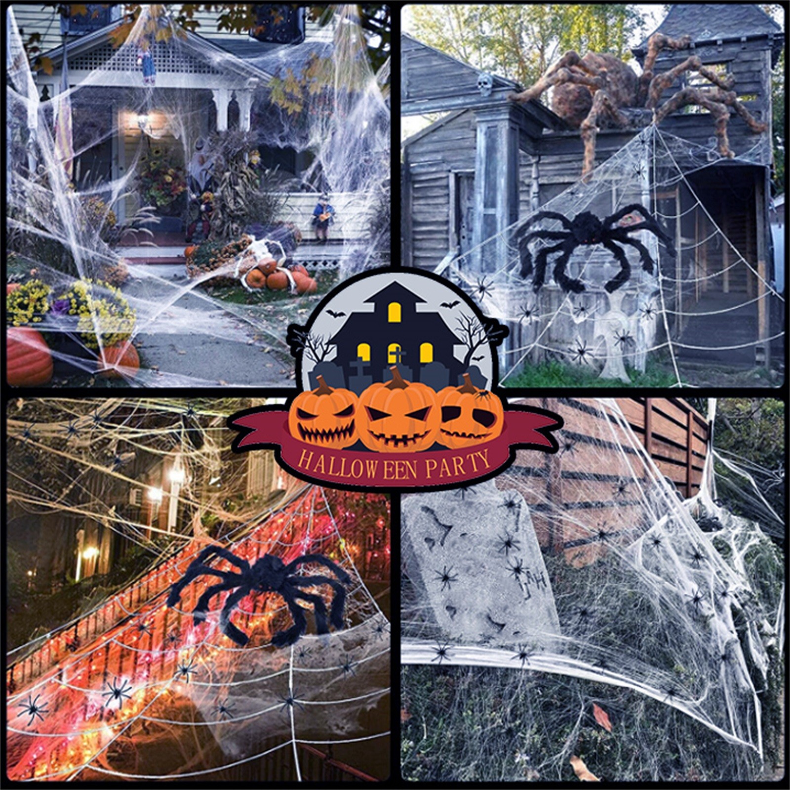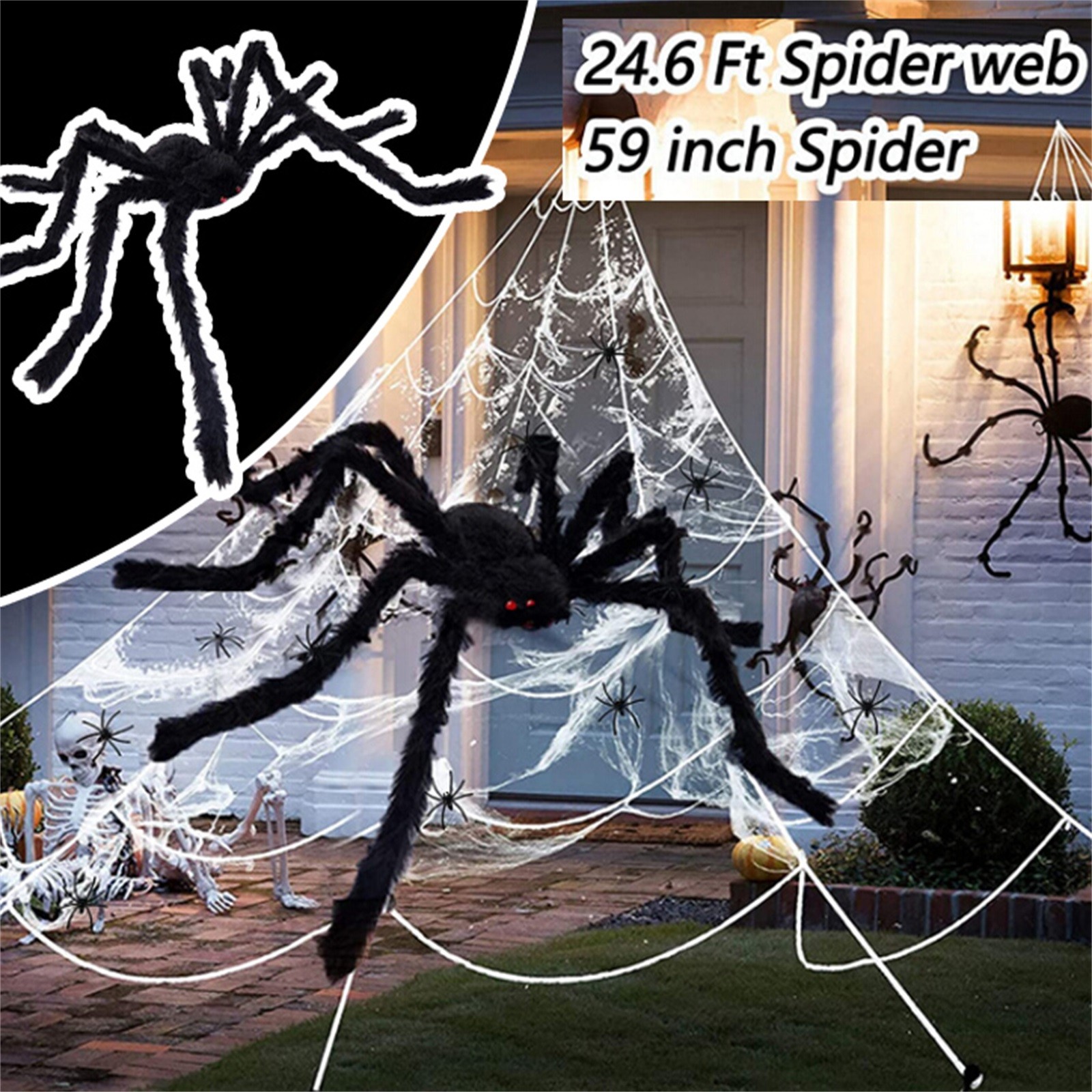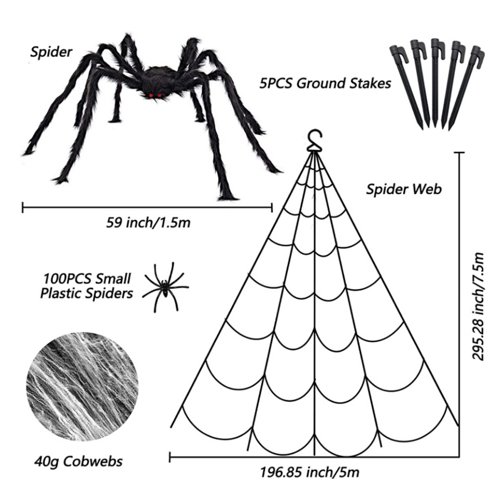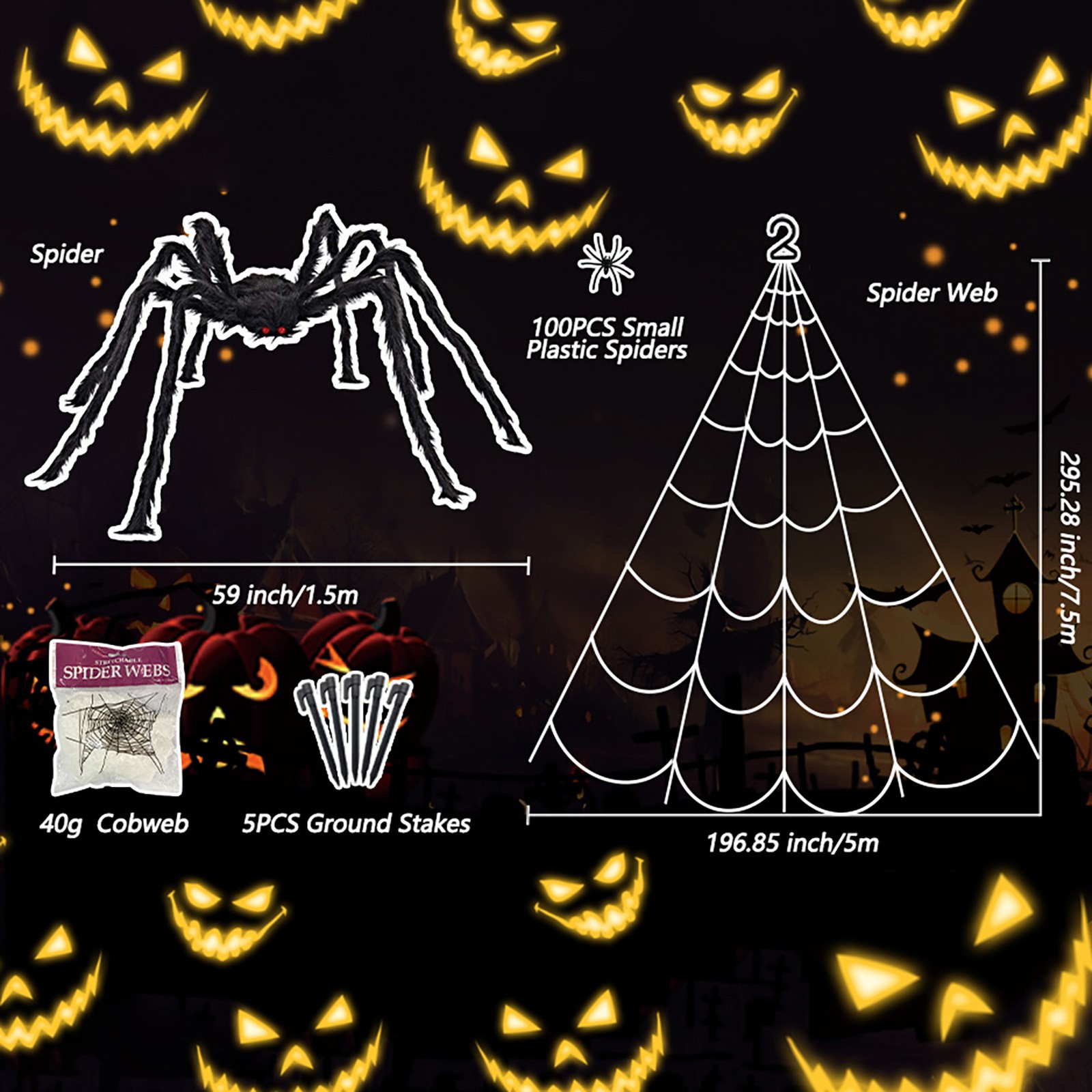 Outdoor Halloween Decor Spider Set: 4 in 1 Spider Web Set, Package Include 295'' Giant Spider Triangular Web with 5 x stakes (for the ground),59'' Larger Scary Spider,40 g Stretchy Cobweb and 100 pack small spiders.Halloween Outdoor Party Decor Creates terrifying scary atmosphere to your home.