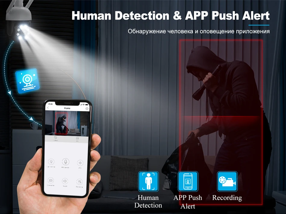 AI Human Body Detection ,Night activating Color onece detecting movement; When someone breaks into shooting area, the camera will make alarm sound and alarm messages will be pushed to your Phone APP.