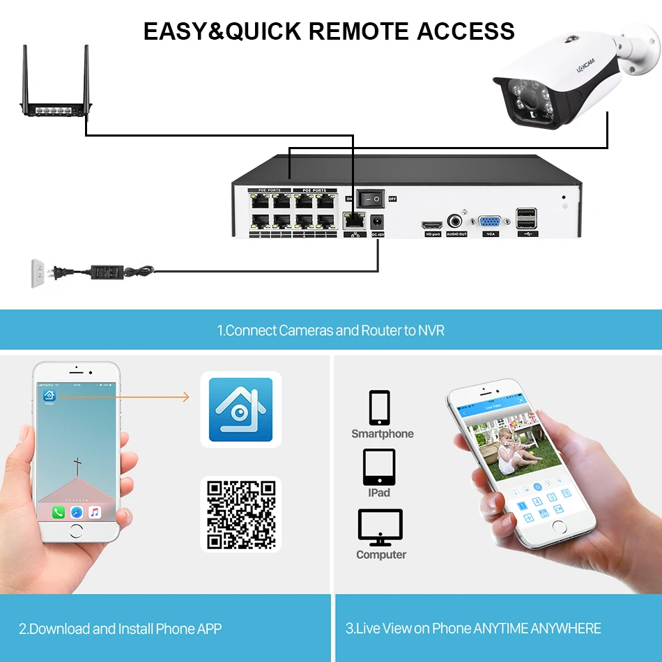 С помощью простого в использовании приложения и программного обеспечения, предназначенного для мобильного доступа, вы можете увидеть все, что видят камеры, даже если вы находитесь в тысячах миль, безопасность находится на ладони.