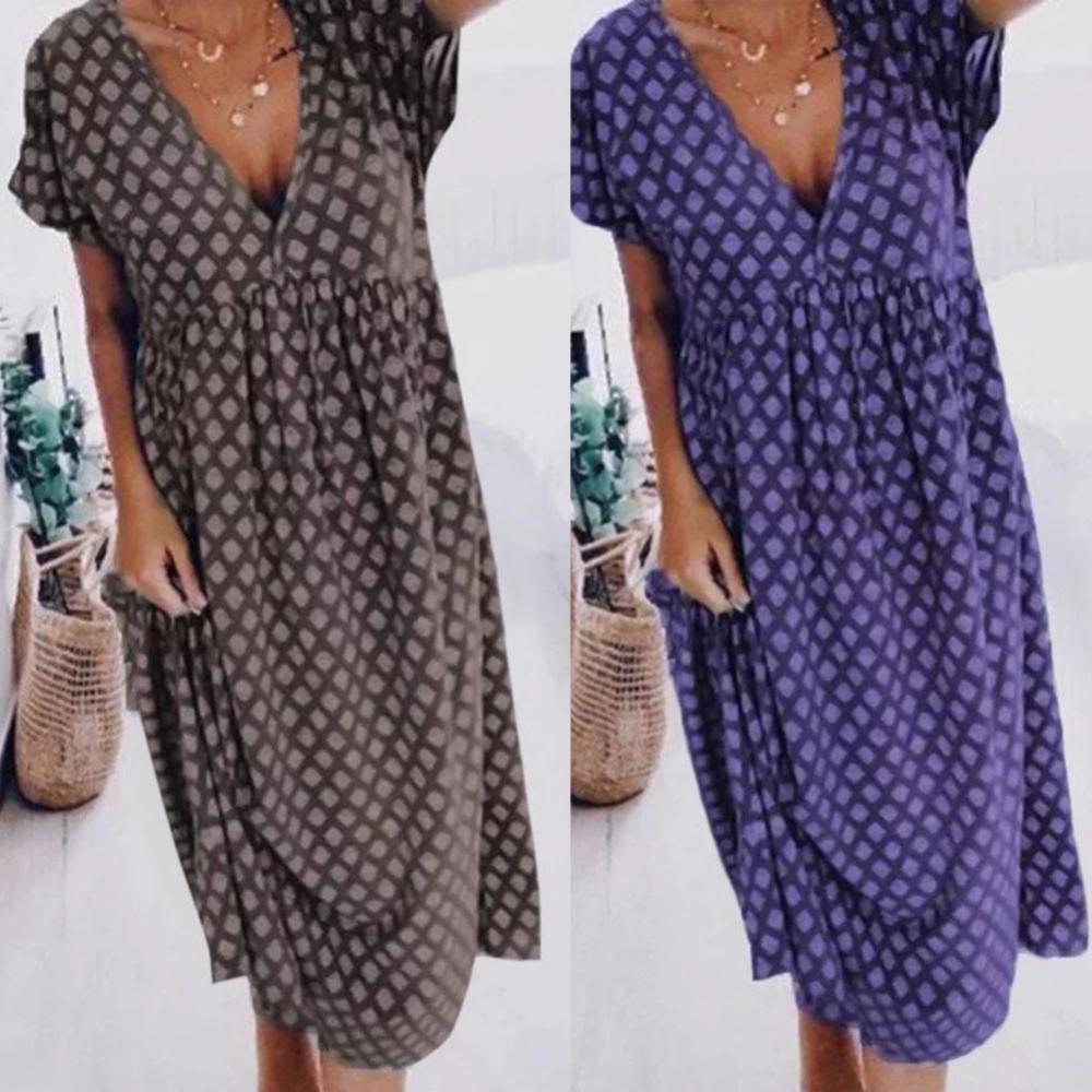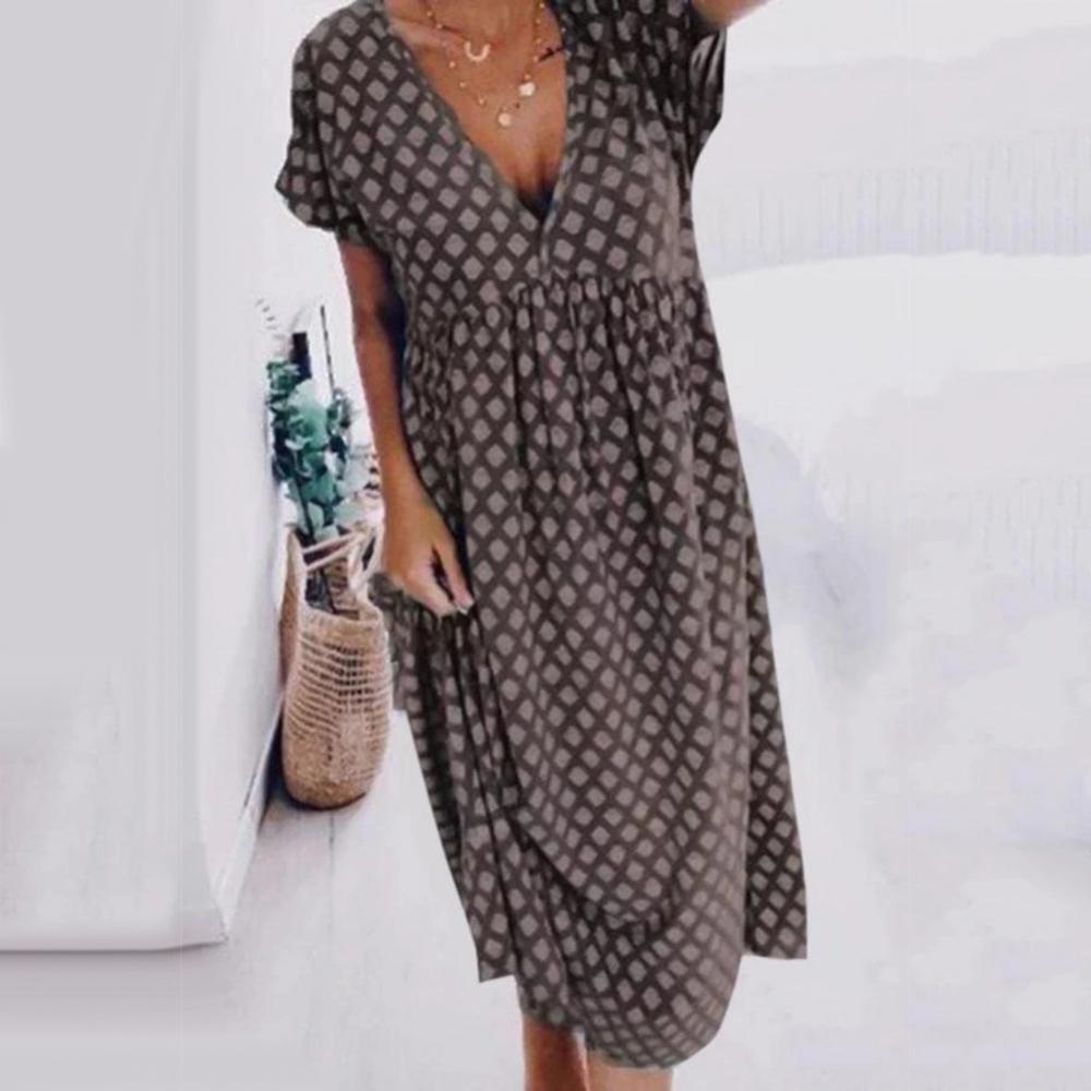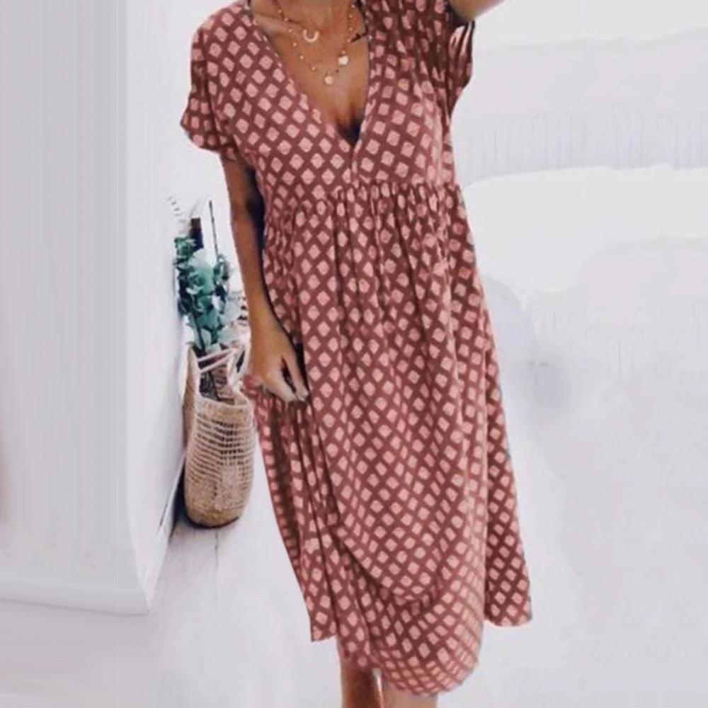 Женское модное платье с коротким рукавом, глубоким v-образным вырезом, геометрическим цветочным принтом, большим подолом, свободное женское платье-миди