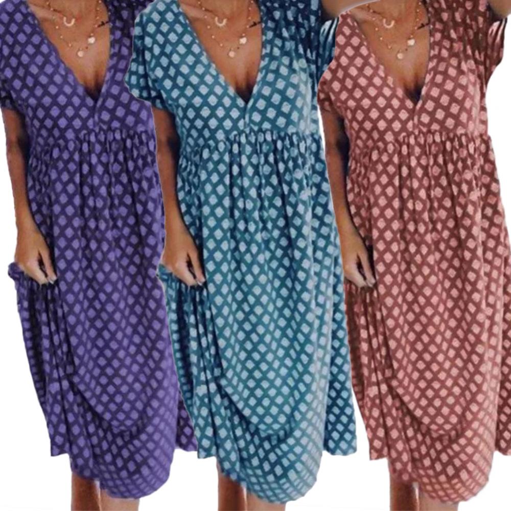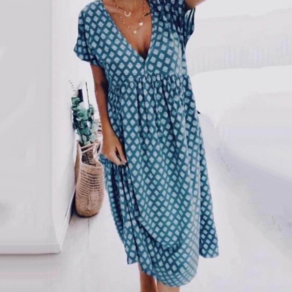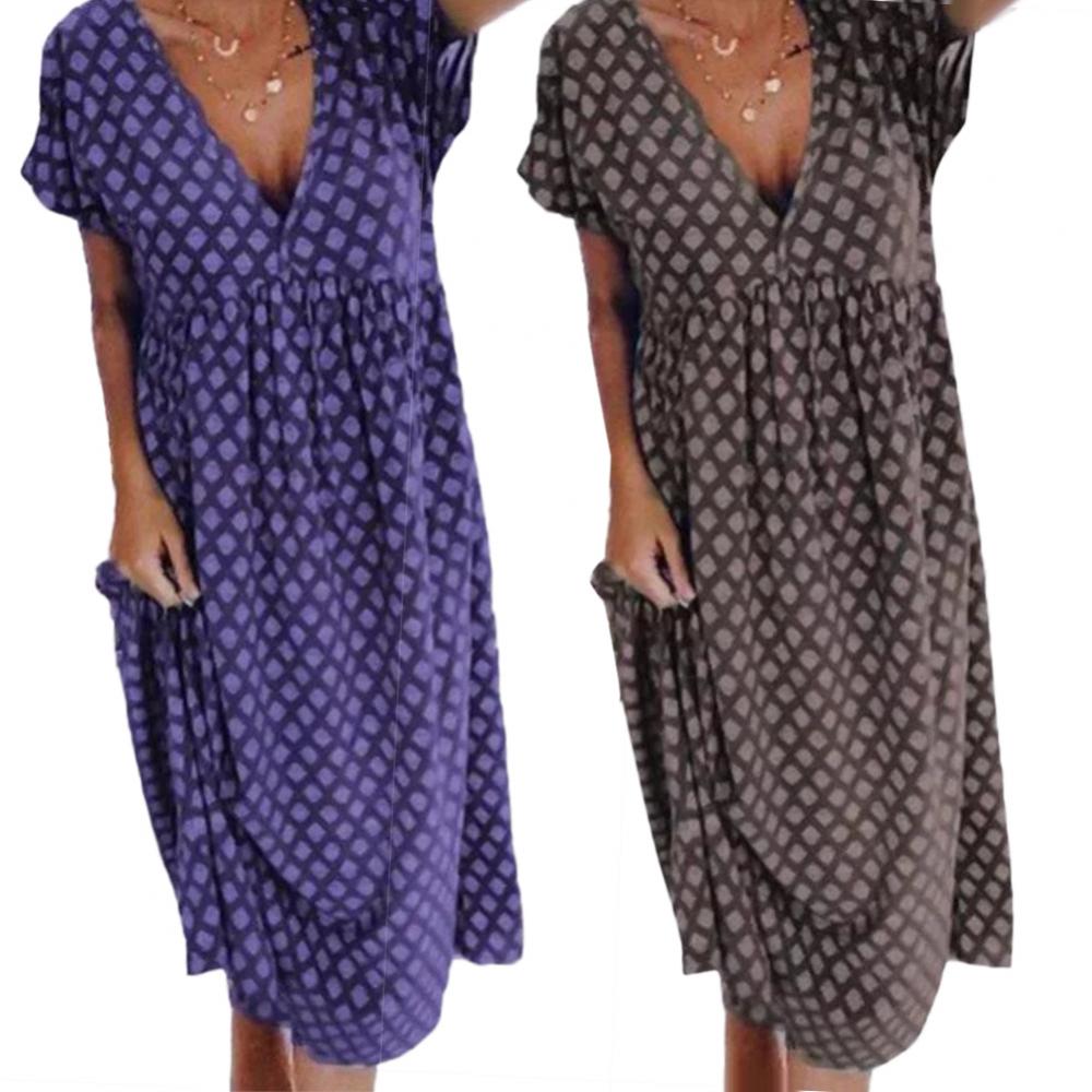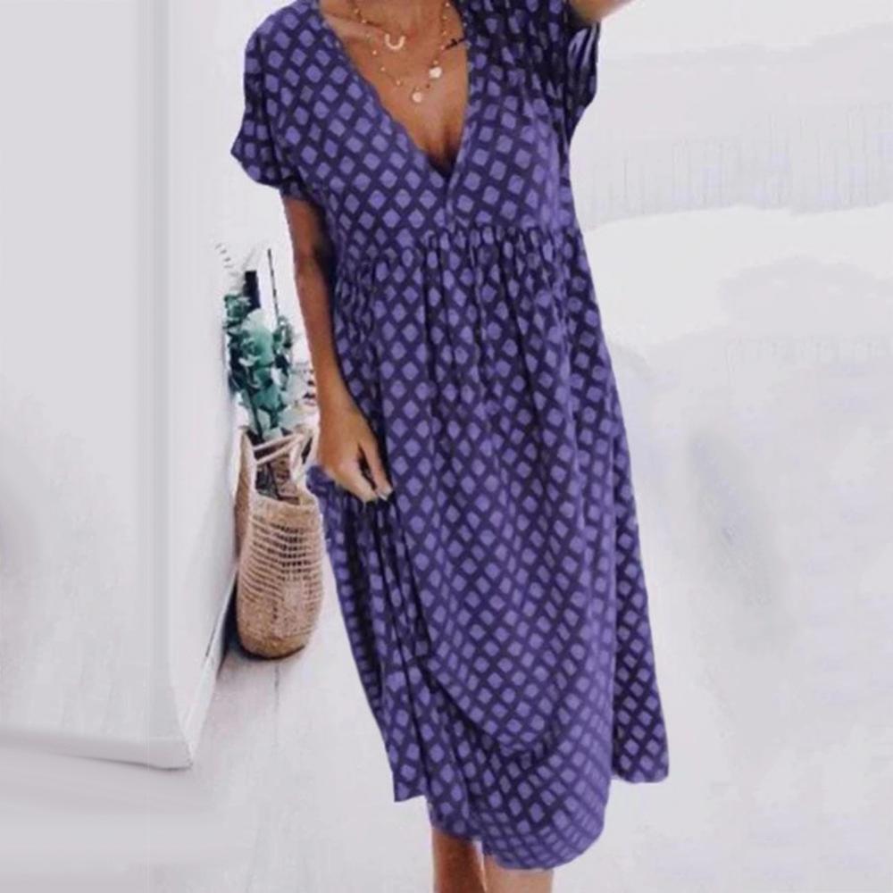 Женское модное платье с коротким рукавом, глубоким v-образным вырезом, геометрическим цветочным принтом, большим подолом, свободное женское платье-миди
