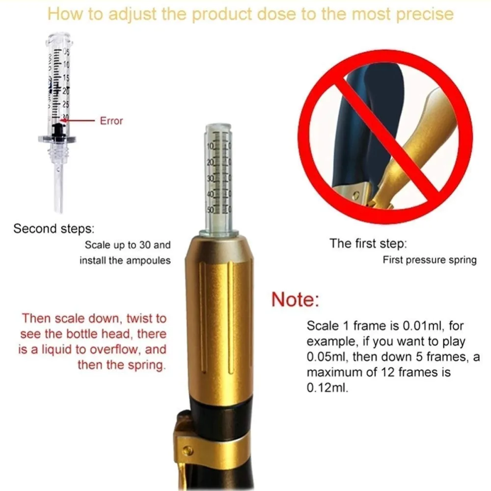 Инжектор без иглы вводится под давлением. Игла не используется для инъекций. Шприц без иглы вводится с помощью сверхпрочной специальной пружины для формирования жидкости через ампулу для формирования жидкости. Колонна проникает в кожу и распыляется под кожу.