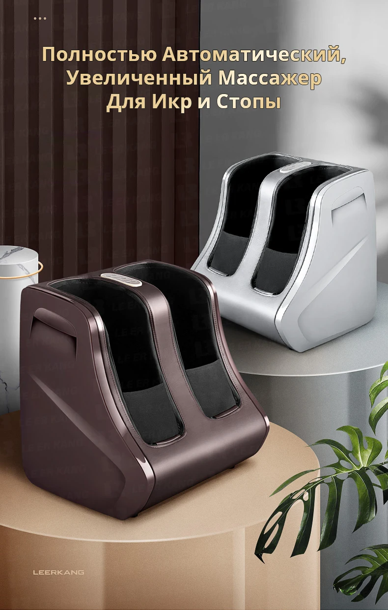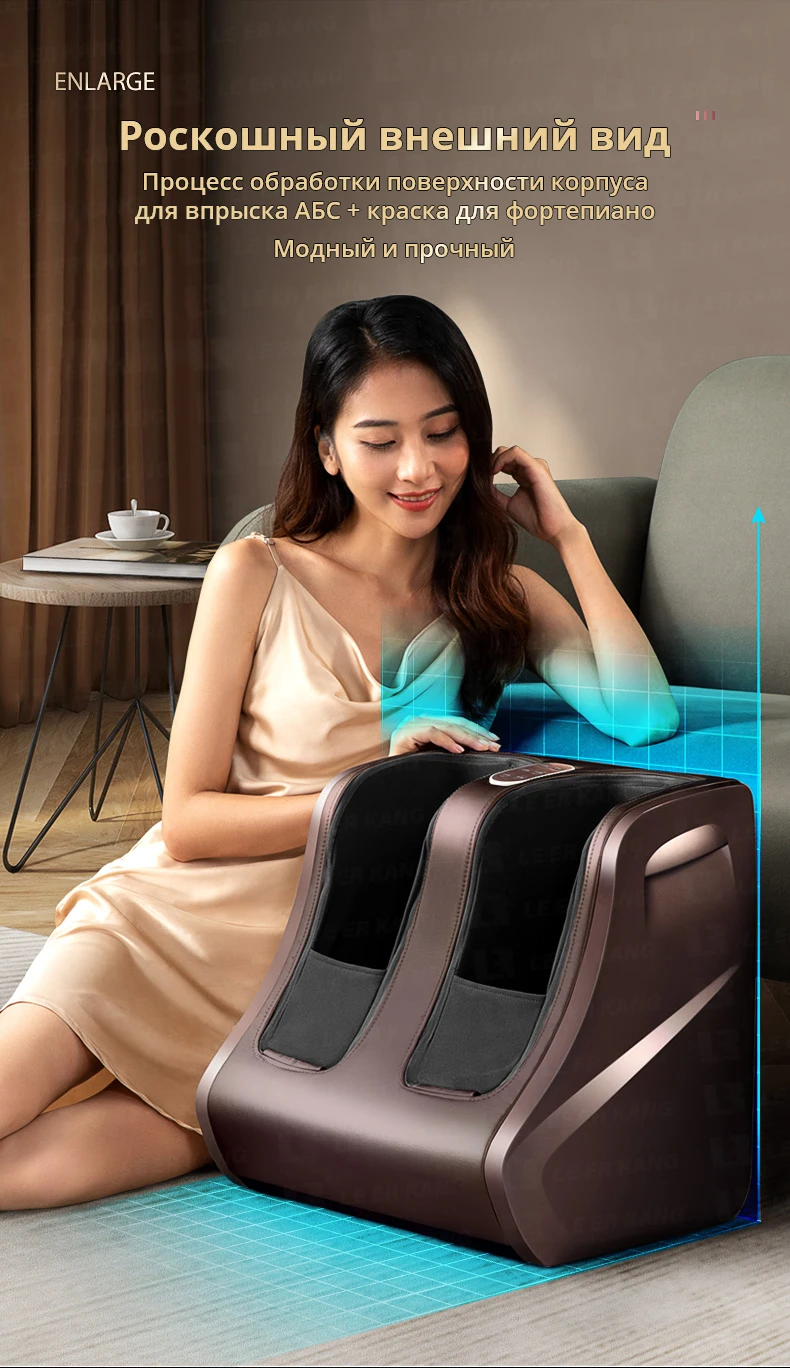Компрессионные подушки оборачивают ноги: по 5 подушек расположено для каждой ноги. Они надуваются и сдуваются, разгоняя застоявшуюся кровь в ногах. Роликовые массажеры расслабляют мышцы, нажимают на важные акупунктурные точки. Рекомендованное время использования - 15 мин.