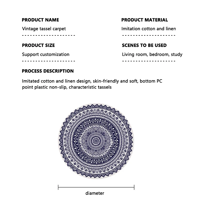 Ткань: хлопок и ленДизайн: кисточкиРазмер: диаметр 60 см/80 см/90 см/100 см/120 смОсобенности: не выцветает, не токсичен, ручная стирка или машинная стирка;Упаковочный лист: 1 шт. * коверПримечание:1. Возможны незначительные различия в цвете из-за различий в мониторах.2. Размер может отличаться на 1-3 см из-за различных измерений вручную.