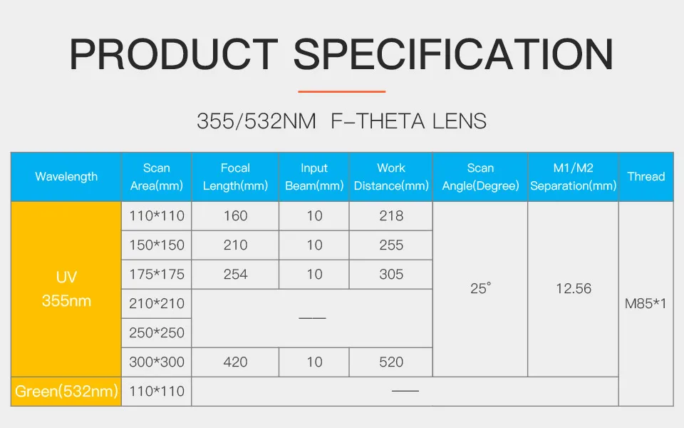 Длина волны: 355нм, зеленый светильник 532нмХарактеристики:110x110 150x150 175x175 210x210 250x250 300x300Применение: УФ-телекоммуникационный лазерный полевой объектив для лазерной маркировочной машины.Другие модели, пожалуйста, нажмите здесь.