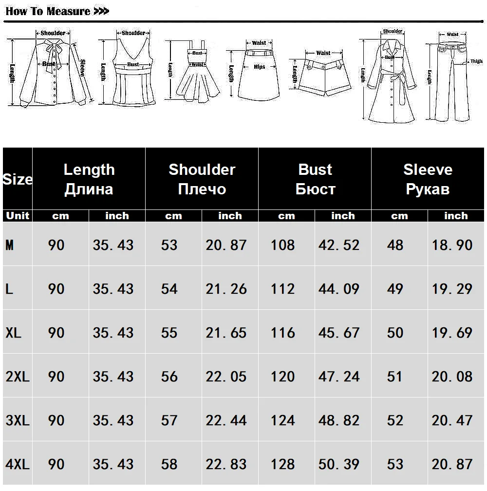 4XL: длина: 90 см/35,43 дюйма, ширина плеч: 58 см/22,83 дюйма, обхват груди: 128 см/50,39 дюйма, длина рукава: 53 см/20,87 дюйма;