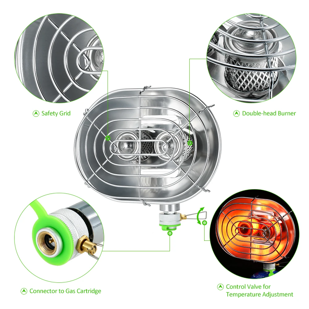 Этот наружный обогреватель оснащен двойной горелкой для обеспечения равномерного нагрева и увеличения теплового излучения. Он прост в использовании и портативен, идеально подходит для использования на открытом воздухе.