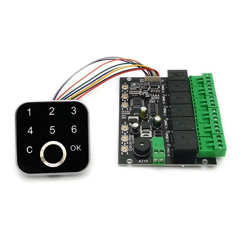 Плата управления K219-B имеет 6 реле, которые могут управлять 6 переключателями одновременно, источник питания 12 В, а выход реле контролируется отпечатками пальцев.