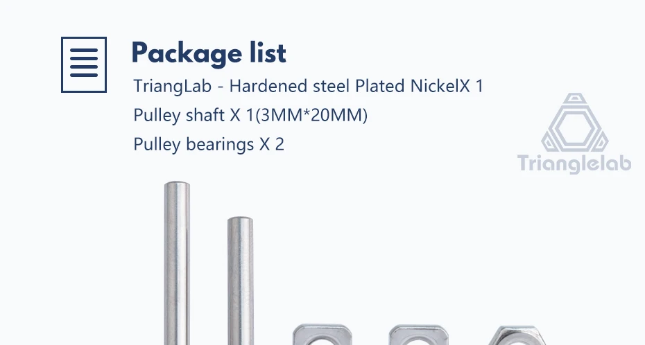1.TriangLab-закаленная сталь никелкс 1* Он более прочный и долговечный. Кусающие зубы очень острые и не легко скользят.2.Вал шкива X 1(3 мм * 20 мм)3.Роликовые подшипники X 2Точность размеров внутреннего отверстия составляет 0,02 мм, что тесно сочетается с валом и обладает высокой концентрациейДемонстрация товара