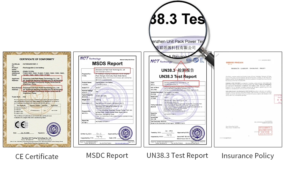 Мы сертифицированы hazmat для отправки наших аккумуляторов, и все наши пакеты протестированы и сертифицированы (un38,3, MSDS, CE) для безопасной доставки и использования.