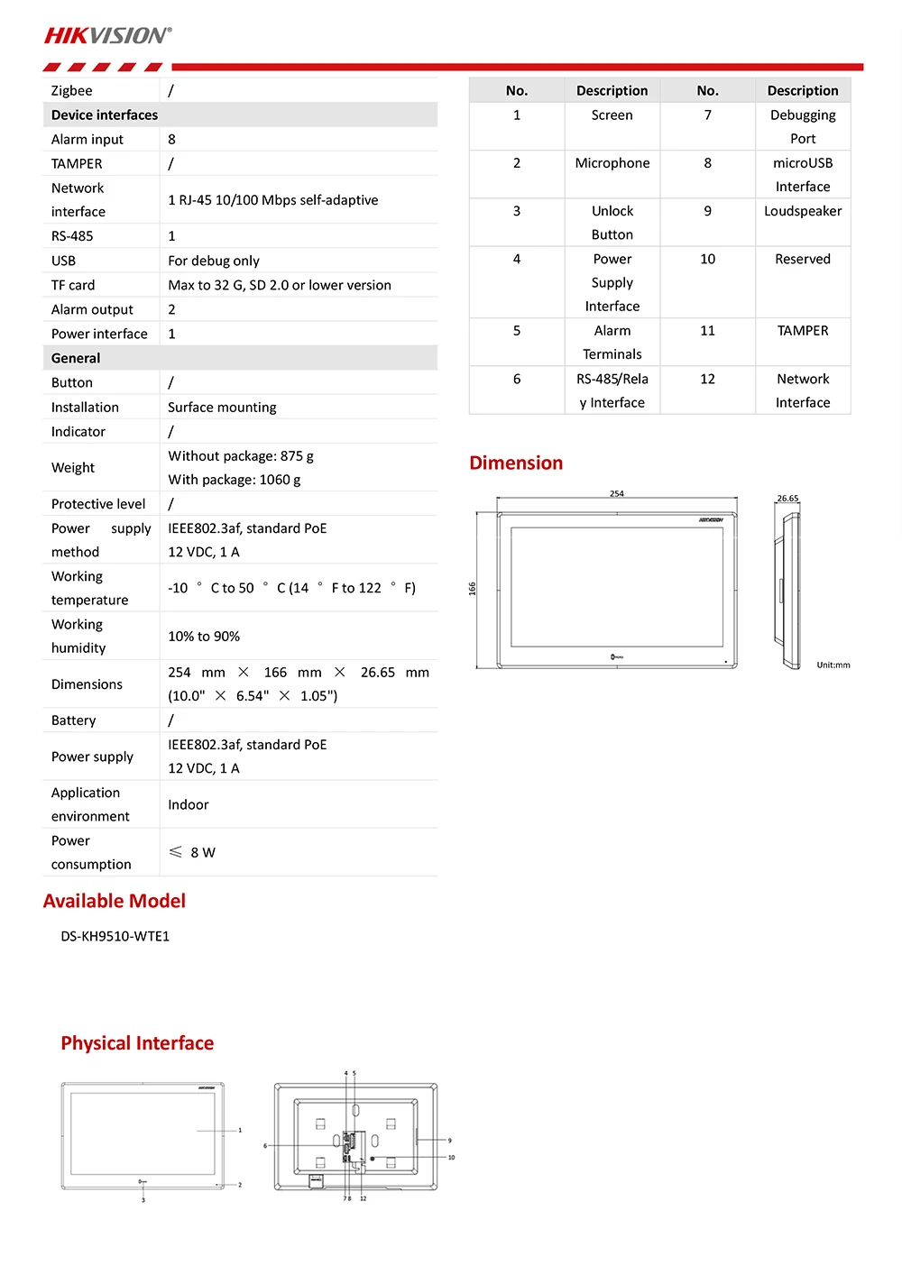 DS-KH9510-WTE1 Original Hikvision Android WIFI Indoor Station POE 10.1-inch Colorful Touch Screen Video Intercom Unlock Door