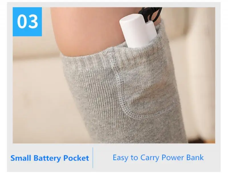 -Нагревательный элемент: нагревательный элемент находится внутри носка. Специально разработанный карман банка питания безопасен и прост в переноске.