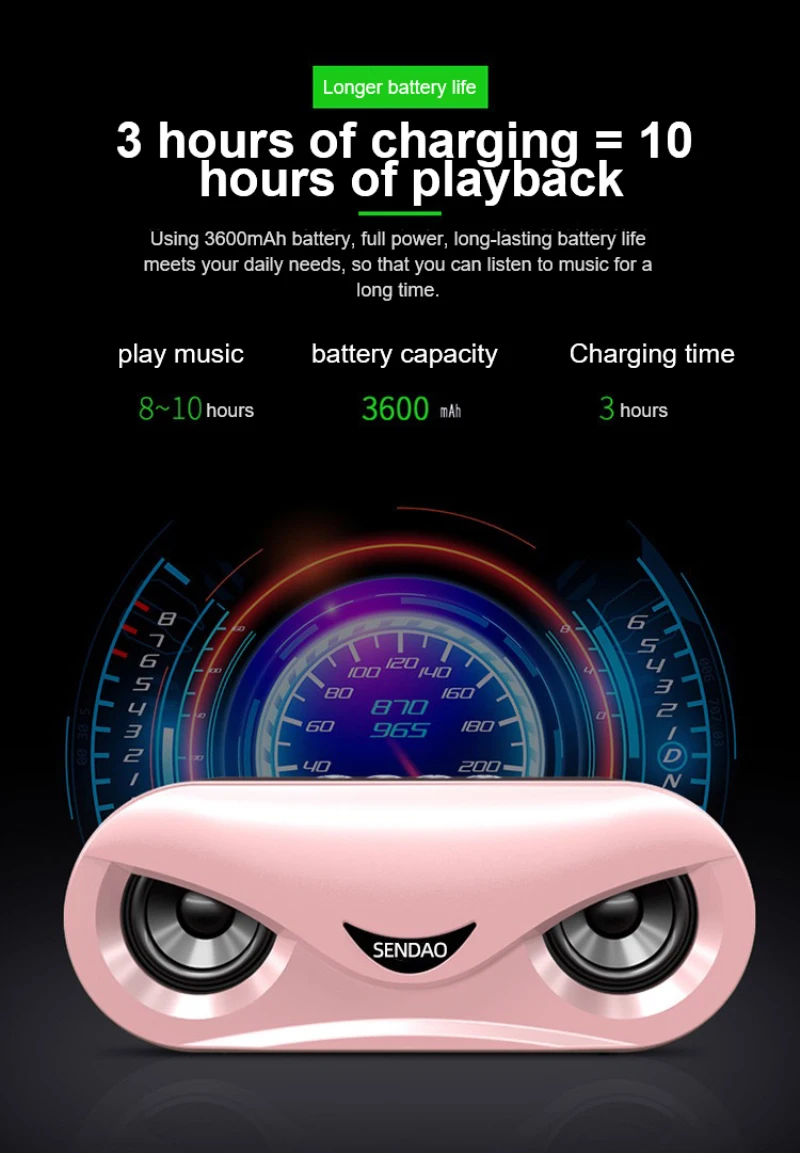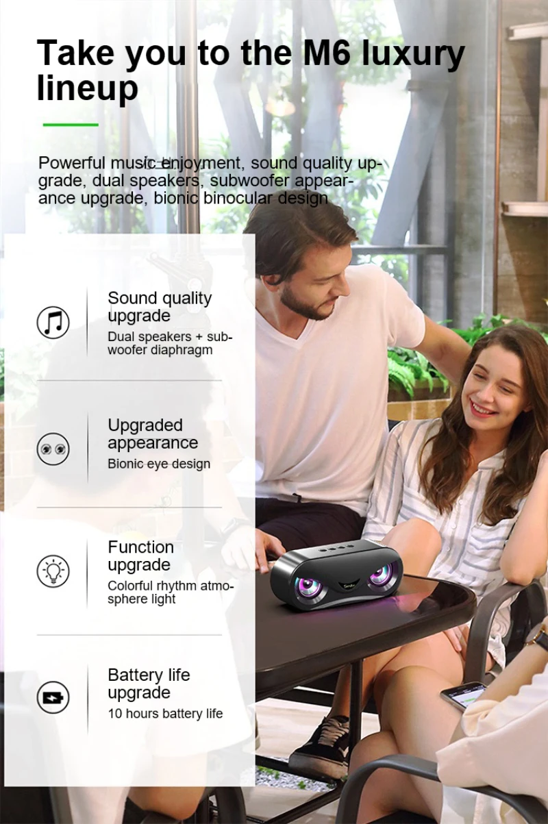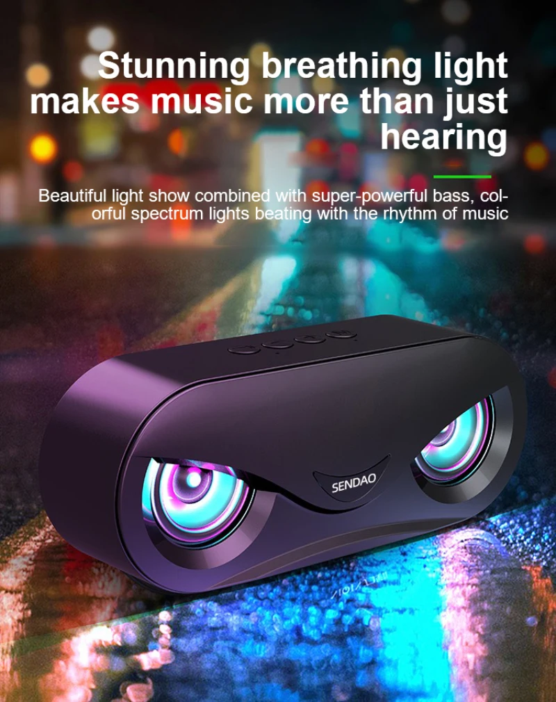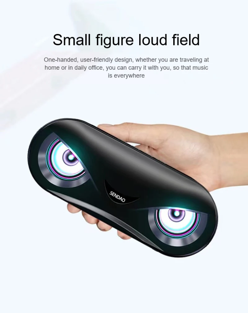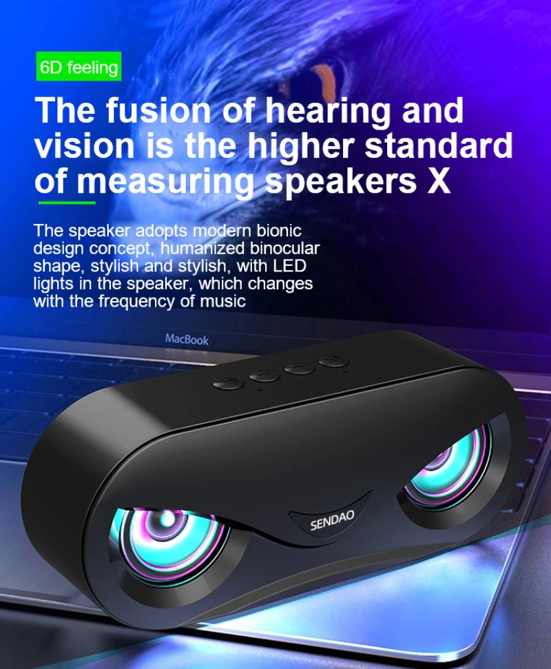 1. Динамик использует концепцию современного бионического дизайна, гуманизированную бинокулярную форму, стильный и стильный, с светодиодный подсветкой внутри динамика, который изменяется с частотой музыки
