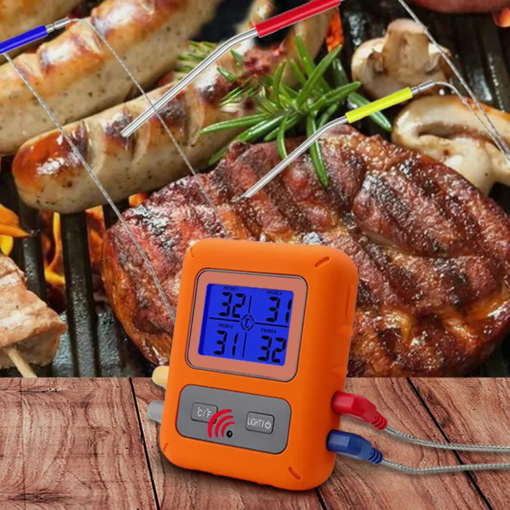 3,4 канал: четырехканальная конструкция может контролировать температуру 4 пищевых продуктов. -Выберите из 8 видов мяса (говядина, ягненок, телятина, курица, индейка, свинина, рыба, бургер), с 5 минут выбора вкуса, приемник будет оповещать, когда температура достигнет значения сигнала тревоги, и цвет подсветки экрана станет оранжевым, «LLL» Будет отображаться ниже самой низкой температуры (-20 ° C), и «HHH» будет отображаться выше самой высокой температуры (300? ° C).