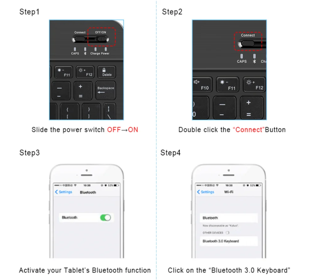Два. Короткое нажатие «Подключение» (кнопка сопряжения), светильник сопряжения Bluetooth будет мигать, и индикатор питания будет оставаться включенным. В это время bluetooth-клавиатура подключается к планшету.