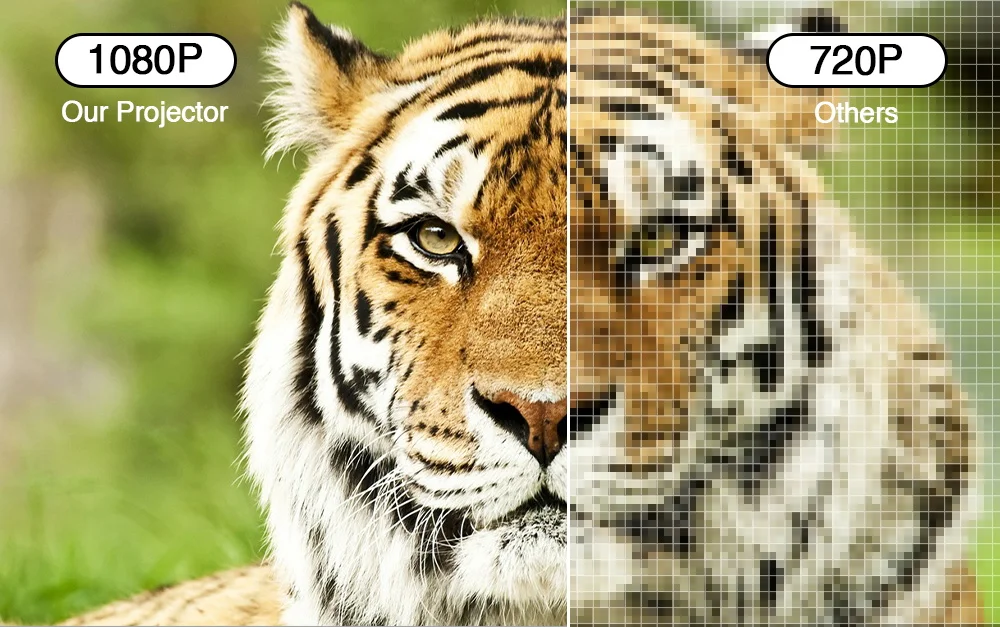 From the comparision of two pictures,you can see the difference.Our projector has 1080p resolution,you can use the projector to watch high picture quality movies.You can see the details of the picture.