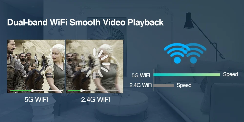 The projector has 2.4g/5g wifi speed,you can use the projector to watch movies smoothly.The projector can give you a good experience to watch movies.