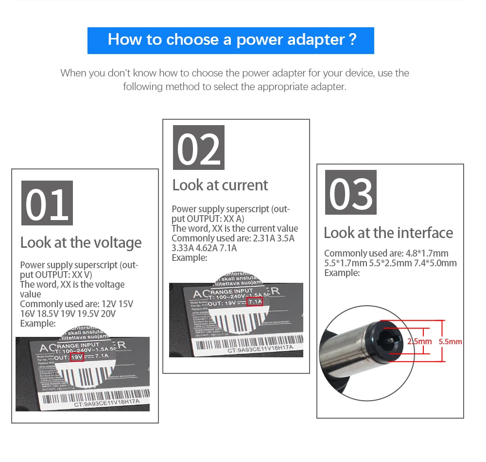 Примечание: прежде чем купить этот товар, избегайте покупки неправильного товара, пожалуйста, проверьте размер разъема напряжения, Ампера и постоянного тока