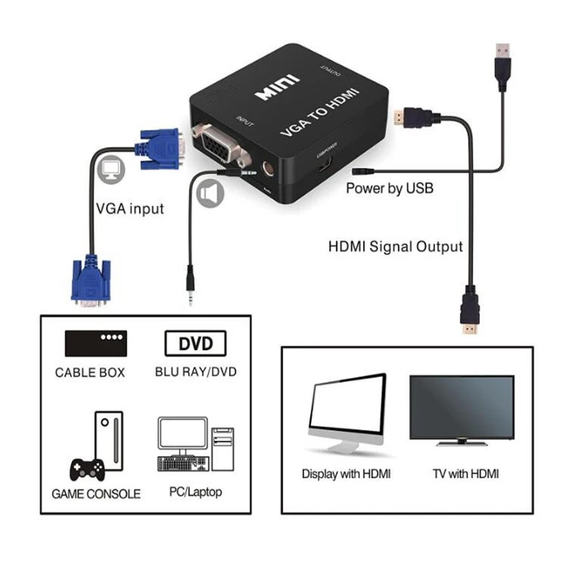 Это usedto преобразование VGA видео и 3,5 мм аналогового аудиосигнала в вашем компьютере к HDMI сигнал и отображать его на большом экране HDTV