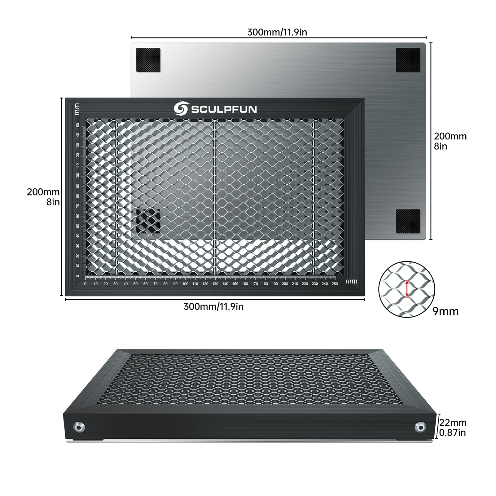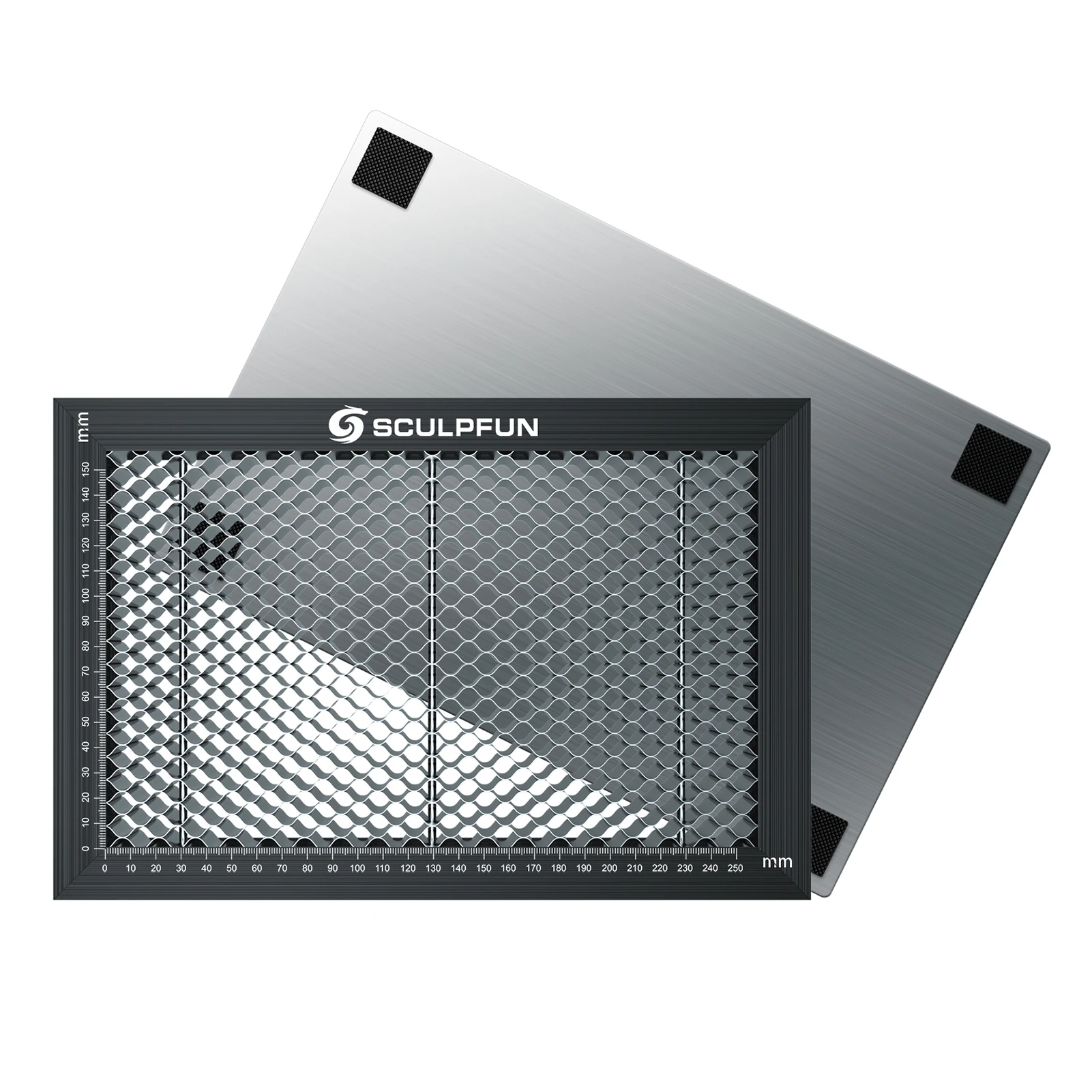 Безопасная металлическая защитная панель для рабочего стола:Сотовая доска SCULPFUN оснащена металлической защитной панелью для рабочего стола, которая может защитить стол от лазерных повреждений, что очень подходит для многих различных лазерных гравировальных аппаратов.