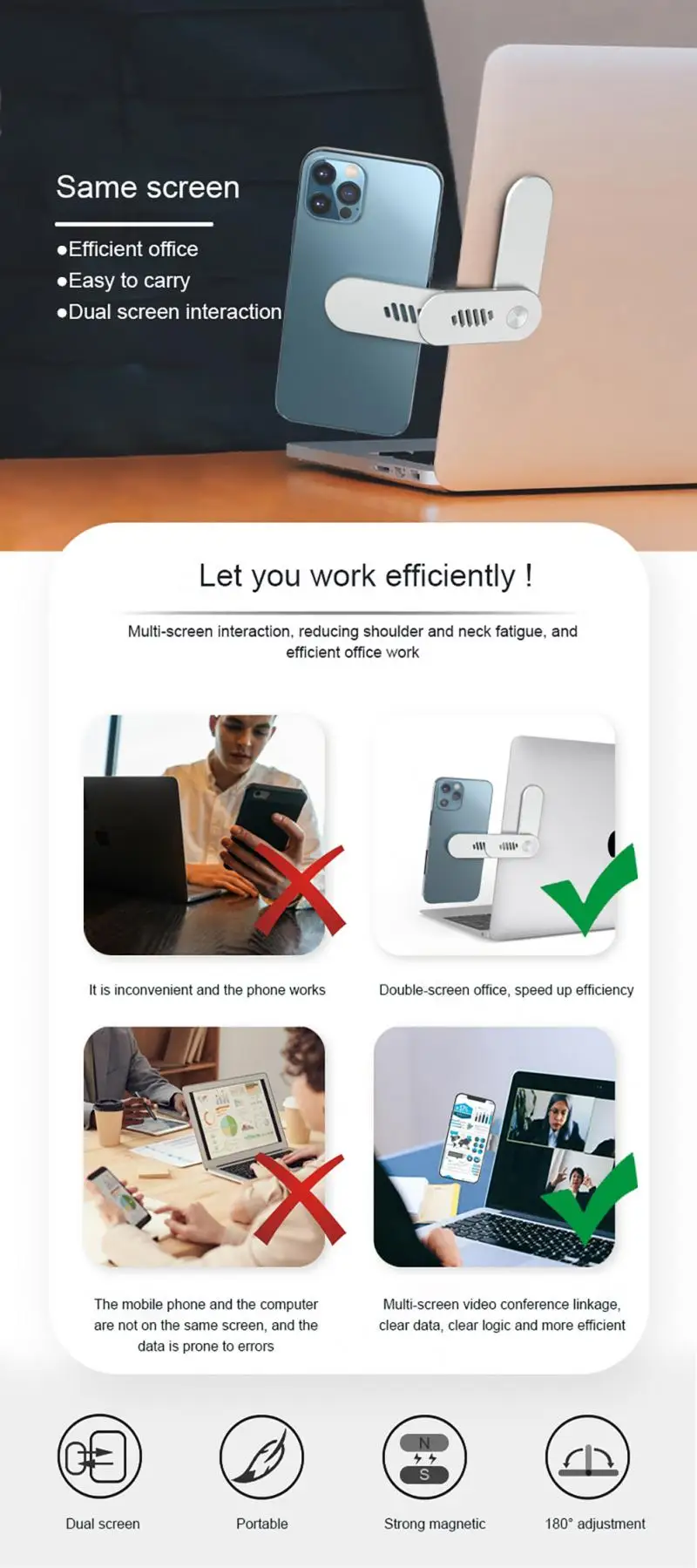 Преимущества: при использовании мобильный телефон и экран компьютера находятся на одной плоскости, поэтому нет необходимости смотреть вниз на мобильный телефон, чтобы просмотреть сообщения, повысить эффективность работы, складная и выдвижная, компактная и легкая, легко хранить и переносить
