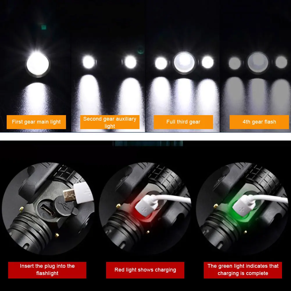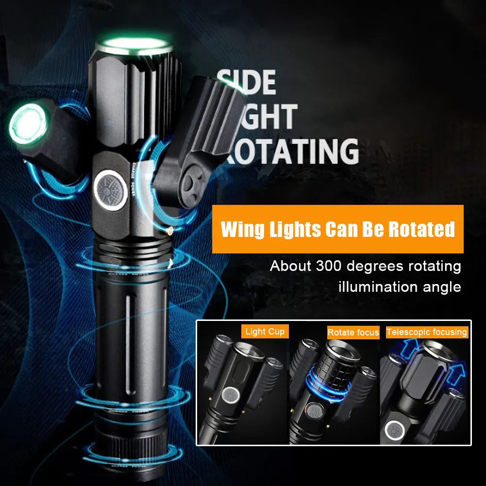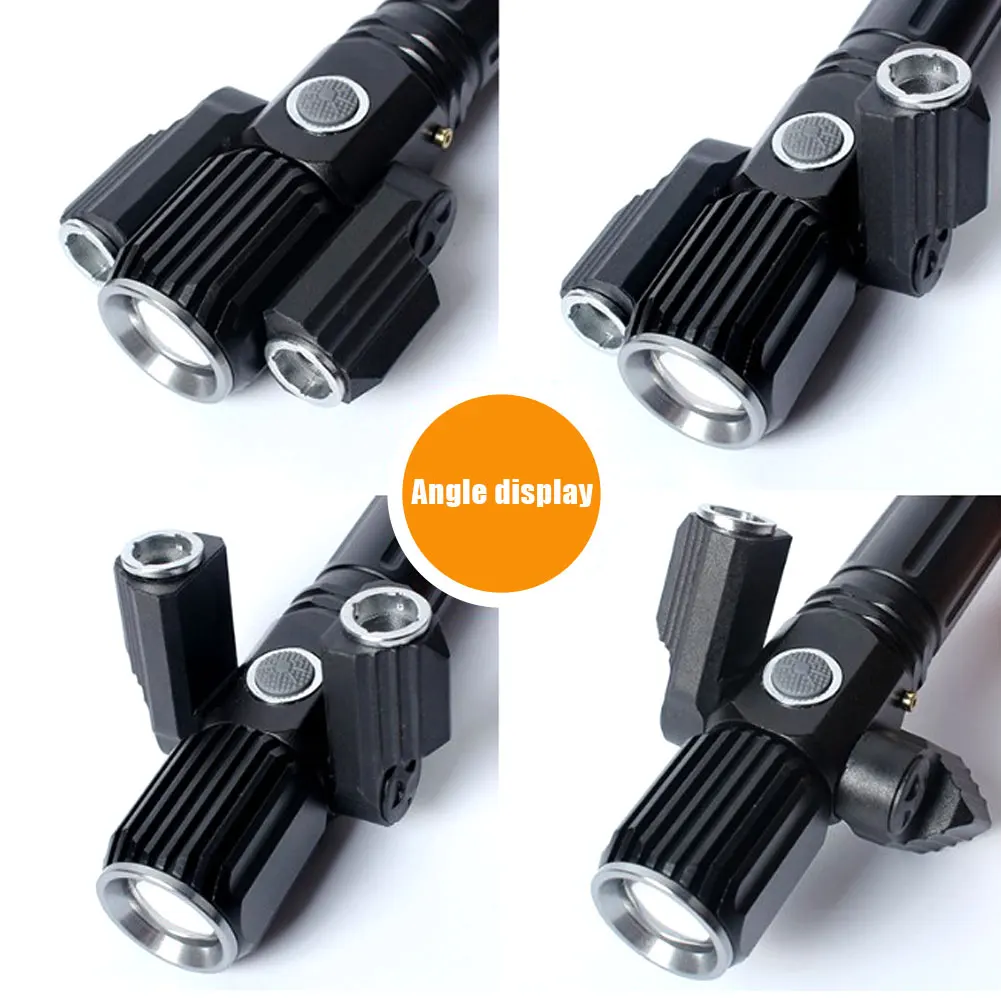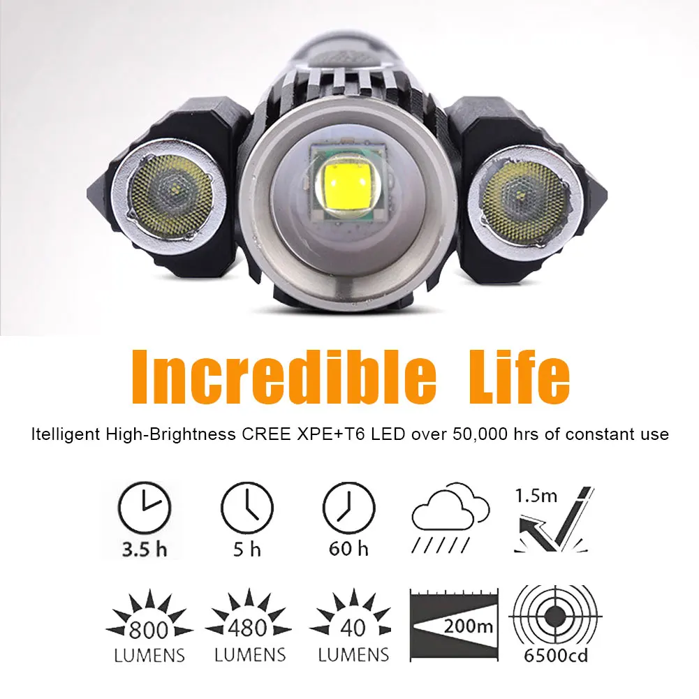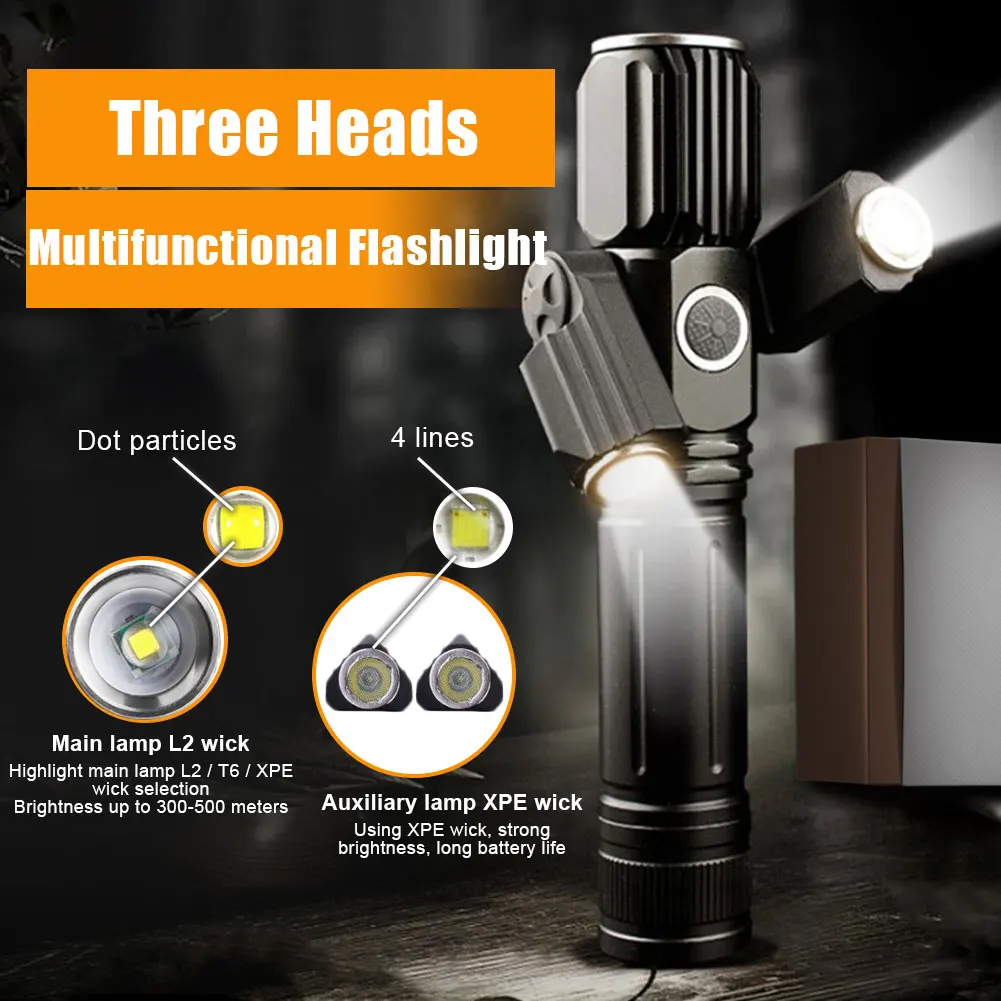 * 1. Усовершенствованный дизайн: Улучшенный светодиодный фонарик с тремя лампами, состоящий из основной лампы (T6) и двух дополнительных ламп (XEP), которые можно поворачивать до 135 градусов для широкоугольного освещения, наблюдение до 400 метров.