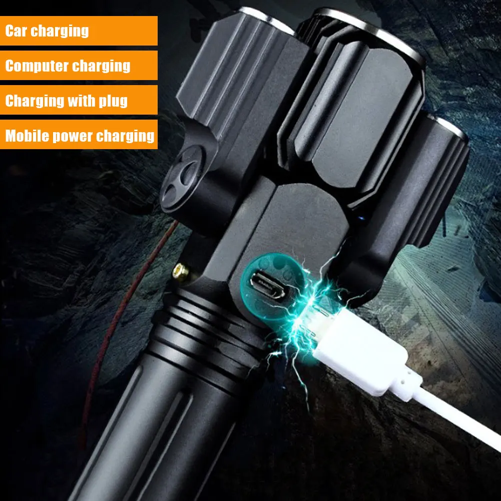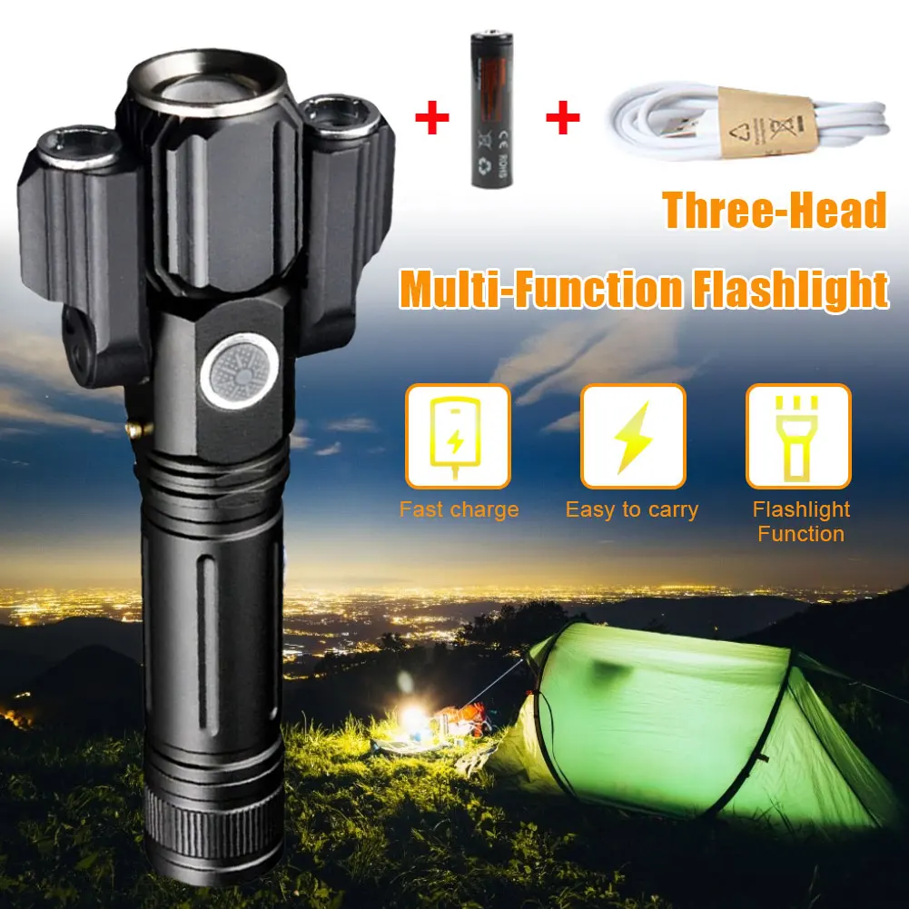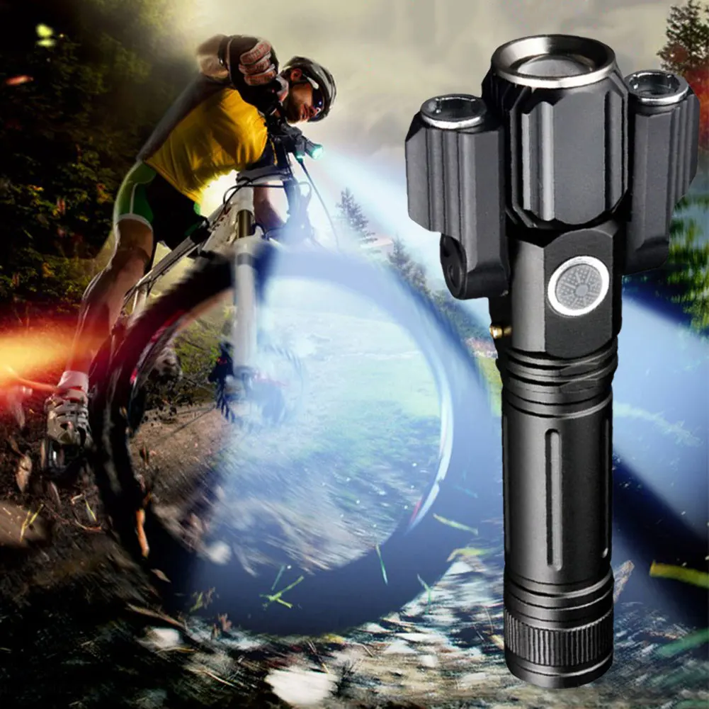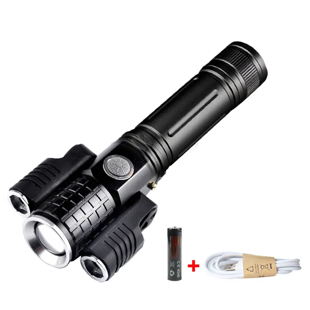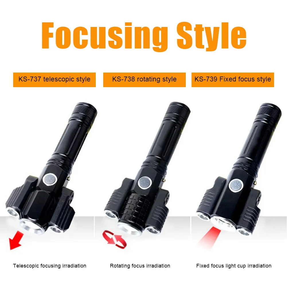 * 1. Усовершенствованный дизайн: Улучшенный светодиодный фонарик с тремя лампами, состоящий из основной лампы (T6) и двух дополнительных ламп (XEP), которые можно поворачивать до 135 градусов для широкоугольного освещения, наблюдение до 400 метров.