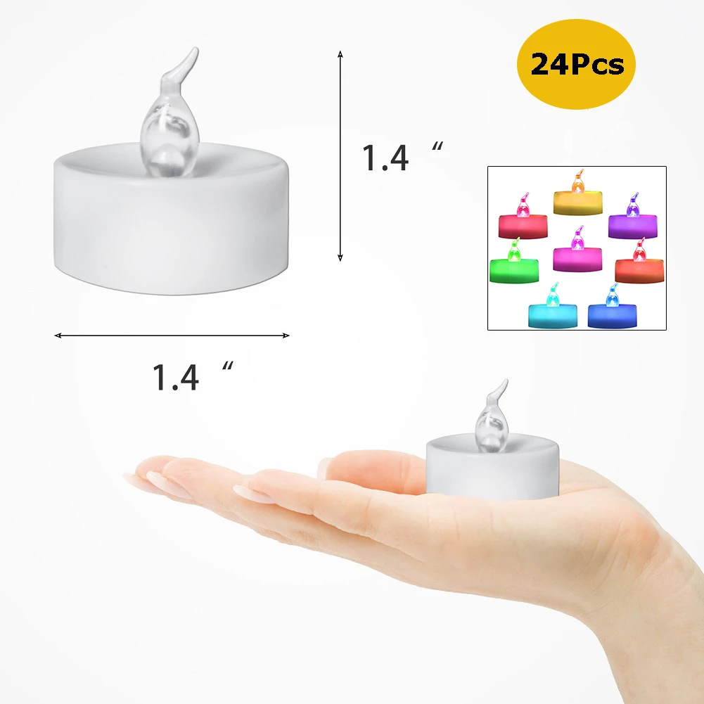 1.Each candlelight is flame shaped and changes through 7 different colors. Not Flickering colorful tea lights, you don't need to worry about this candles flash too fast to make you Dizzy.