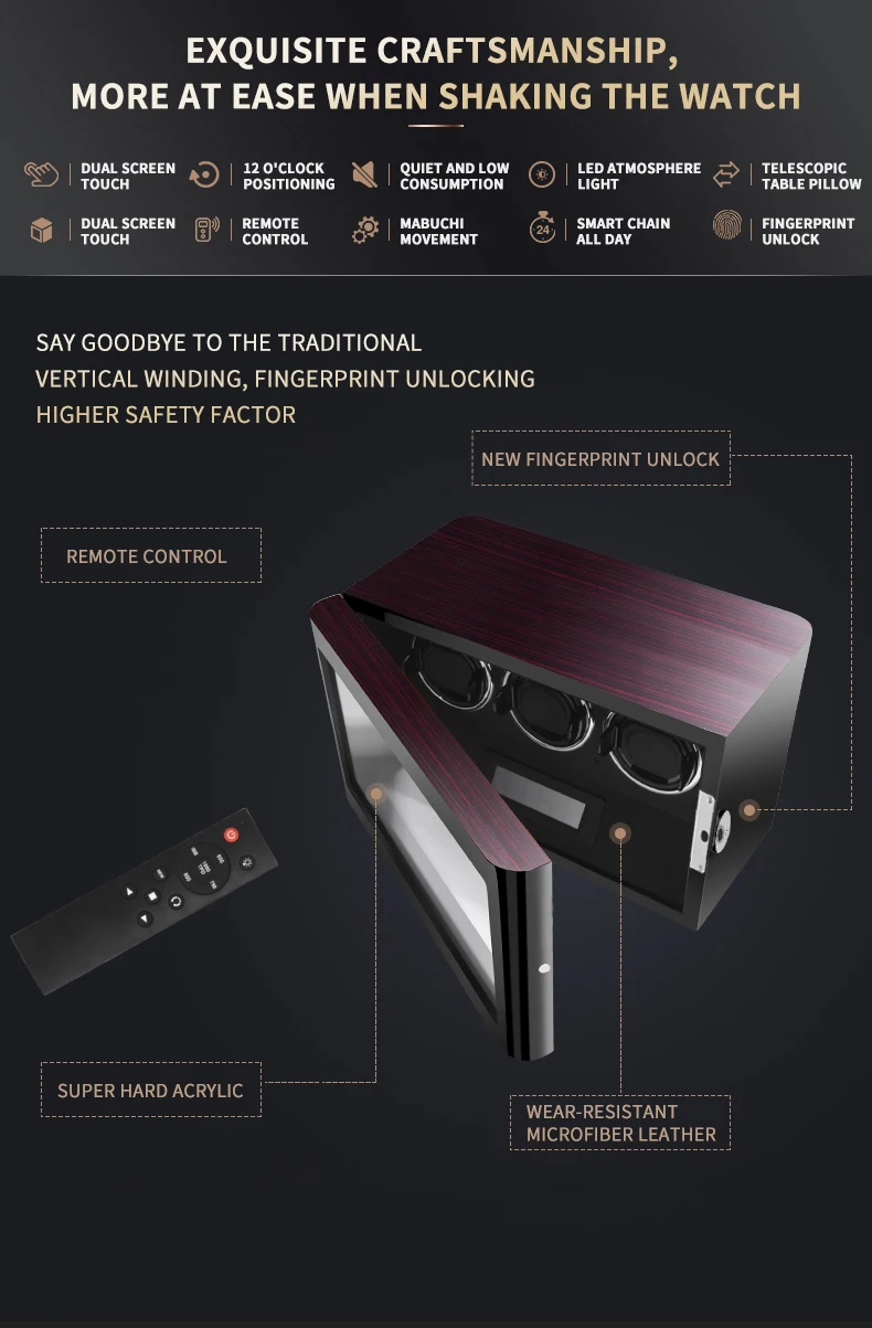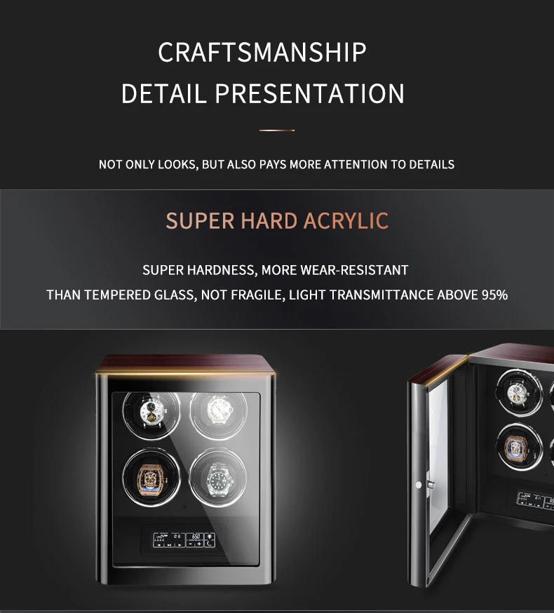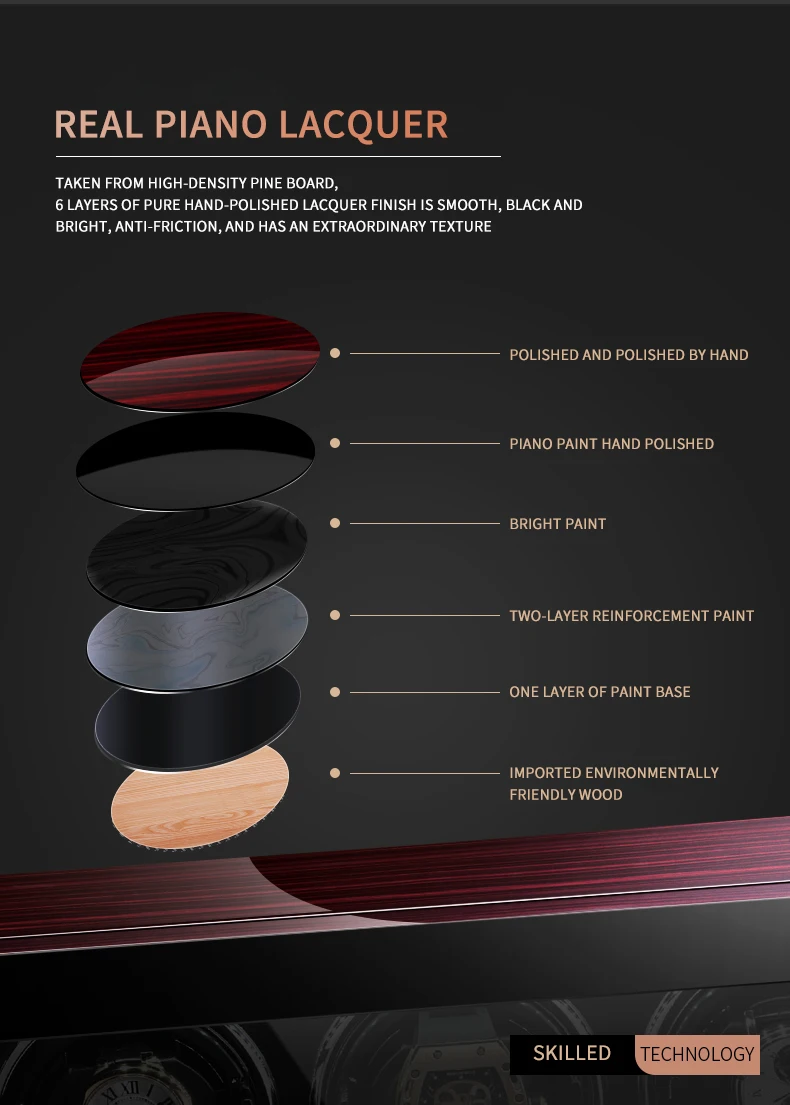 Материал корпуса для фортепиано полностью ручной работы, обработан достаточным количеством раскрашивания-сушки-печати под современными направлениями. Элегантный дизайн и высококлассные вставки из кожзаменителя, которые подойдут для украшения интерьера высокого класса и создают уникальную атмосферу культуры в различных стилях декора. Видимое стекло закаленное для хорошей защиты. Управление сенсорным ЖК-экраном позволяет настроить каждый намотку на желаемые настройки для каждой часы.