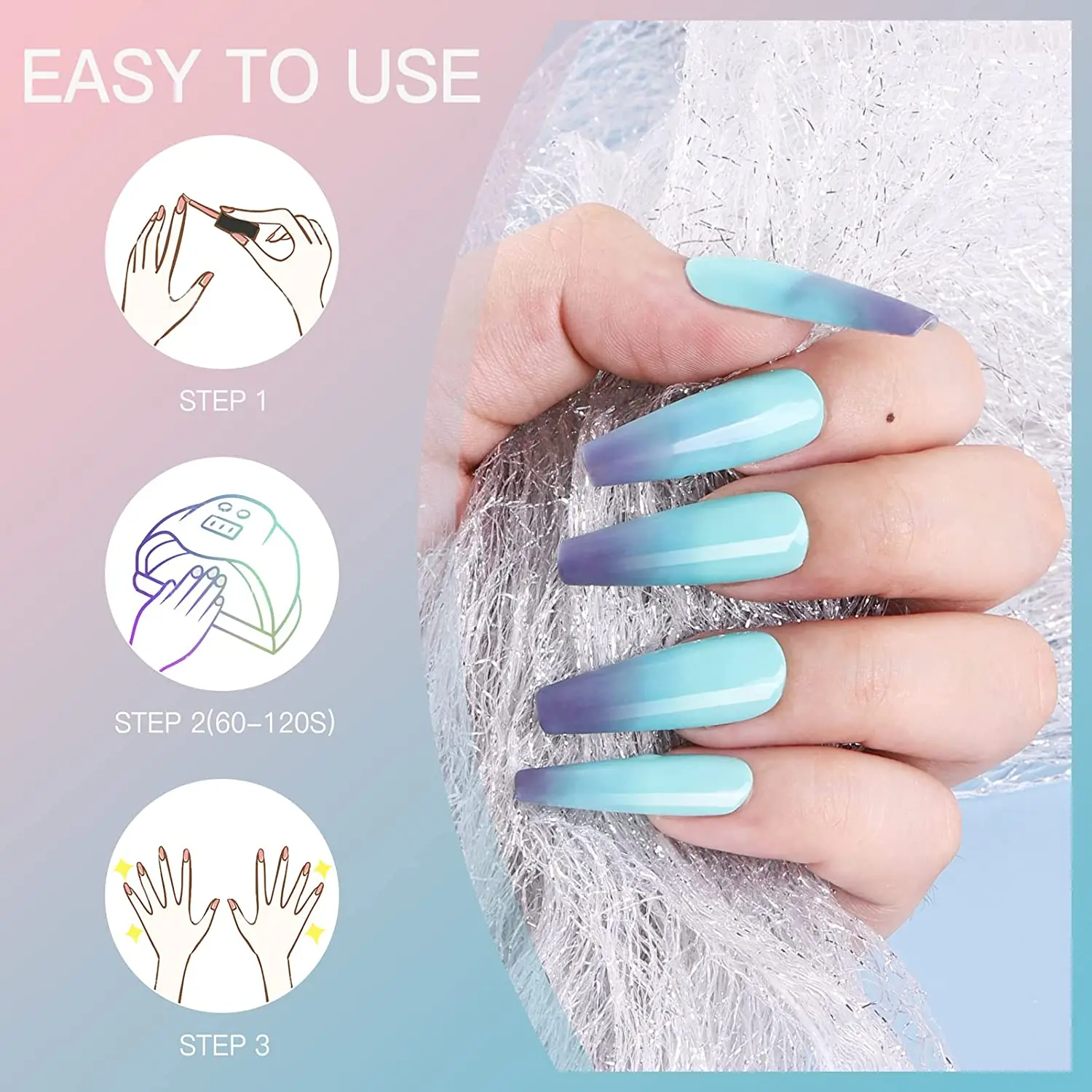 【Изменение 3 вида цветов gel гель лак для ногтей изменение цвета зависит не только от температуры тела, но и от температуры окружающей среды. Когда температура в 0 ℃-20 ℃-40 ℃, цвет гелевого ногтя автоматически изменится 3 вида цветов. Положите в холодную или горячую воду, чтобы почувствовать волшебное изменение дизайна ногтей.