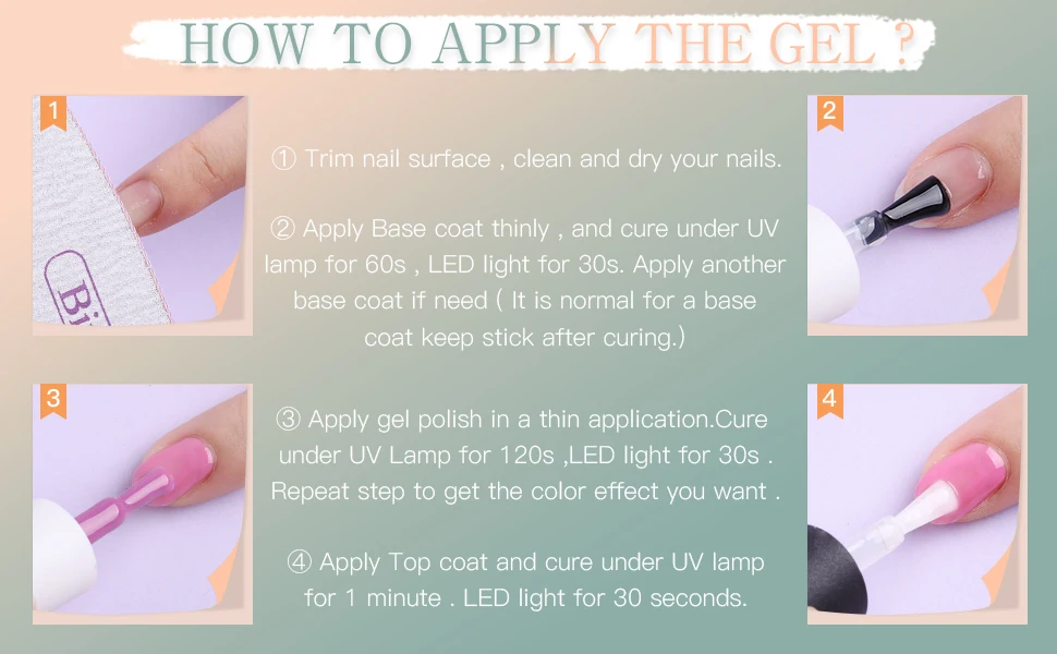 2. Мы предлагаем вам использовать пилку для ногтей/Дегидратор (перед базовым покрытием), чтобы убедиться, что ваши ногти полностью сухие, чистые и без масла, что позволит избежать антипригарного, не долговечен и не отслаивается