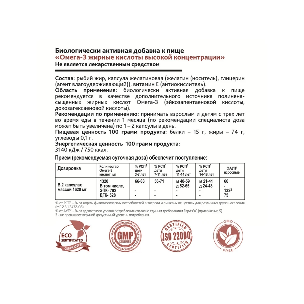 1 - 4 капсулы в день. Рекомендуемая суточная доза (4 капсулы массой 790 мг) обеспечит поступление: Омега-3 ПНЖК - 1320 мг из которых: эйкозапентаеновой кислоты (ЭПК) – 792 мг; докозагексаеновой кислоты (ДГК) – 528 мг.