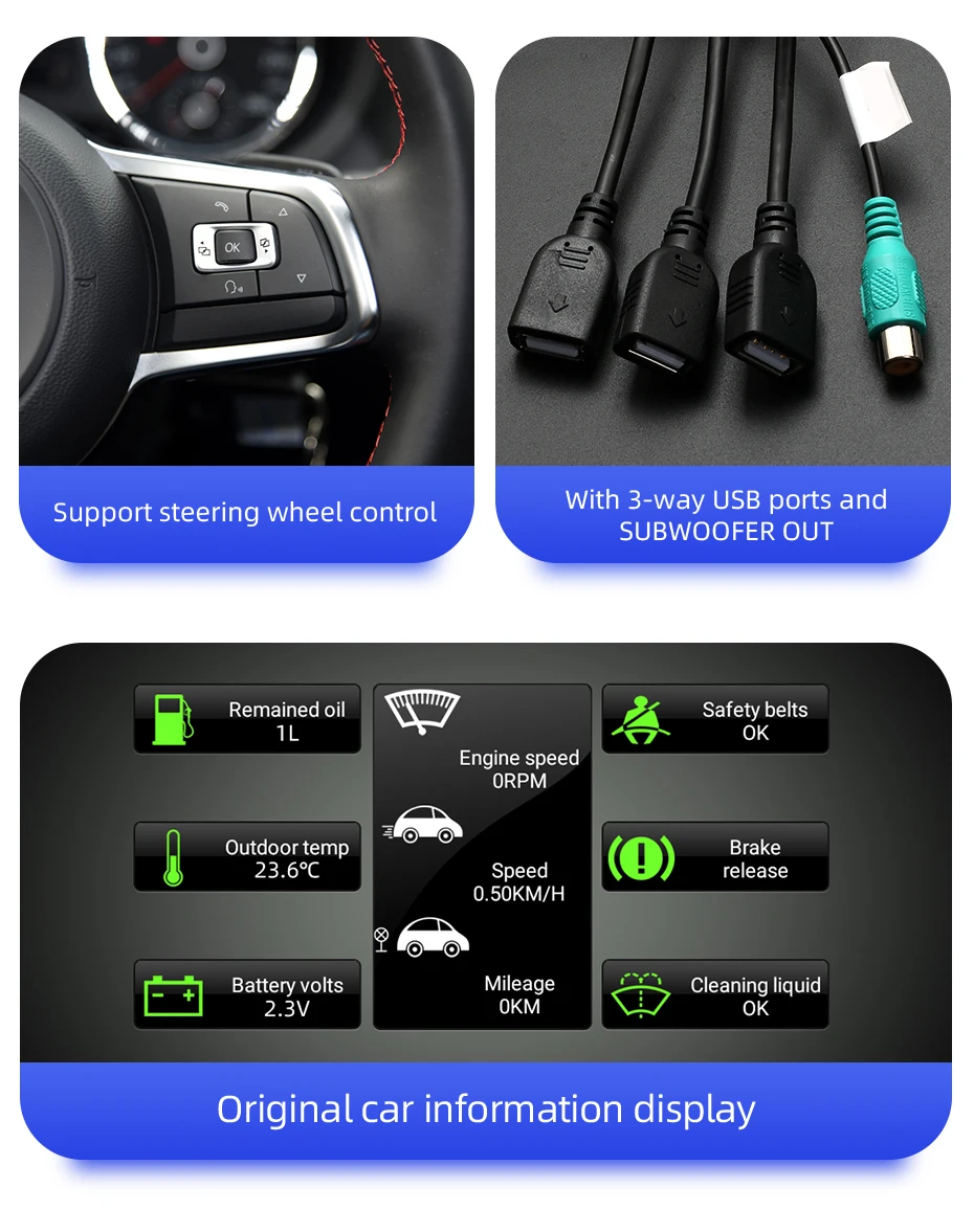 1. С декодером Canbus, поддержкой рулевого колеса и оригинальным автомобильным информационным дисплеем.