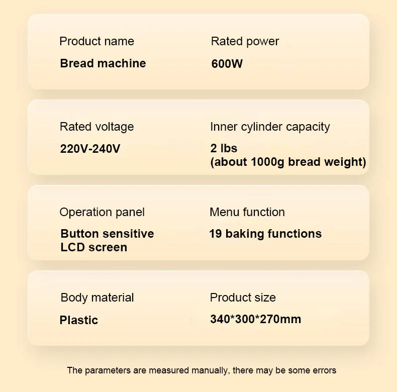 Номинальное напряжение: 220 ВНоминальная частота: 50 ГцНоминальная мощность: 600 ВтЕмкость изделия: 750 г/1000 гРазмер изделия: 340*300*270 мм