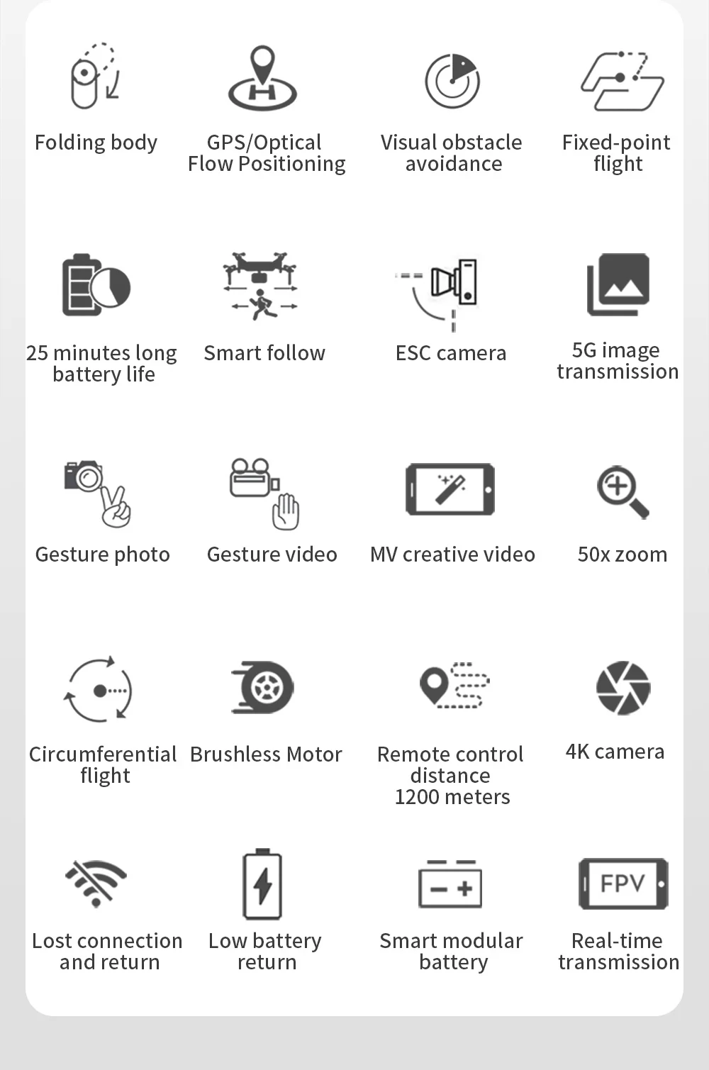 -Следуйте за мной режим. Дрон будет автоматически следовать за вами и захватывает вас везде, где вы двигаетесь. Держать вас в кадре в любое время, легче получить сложные снимки, обеспечивает беспилотный полет и самообслуживанияС визуальным предотвращением препятствий